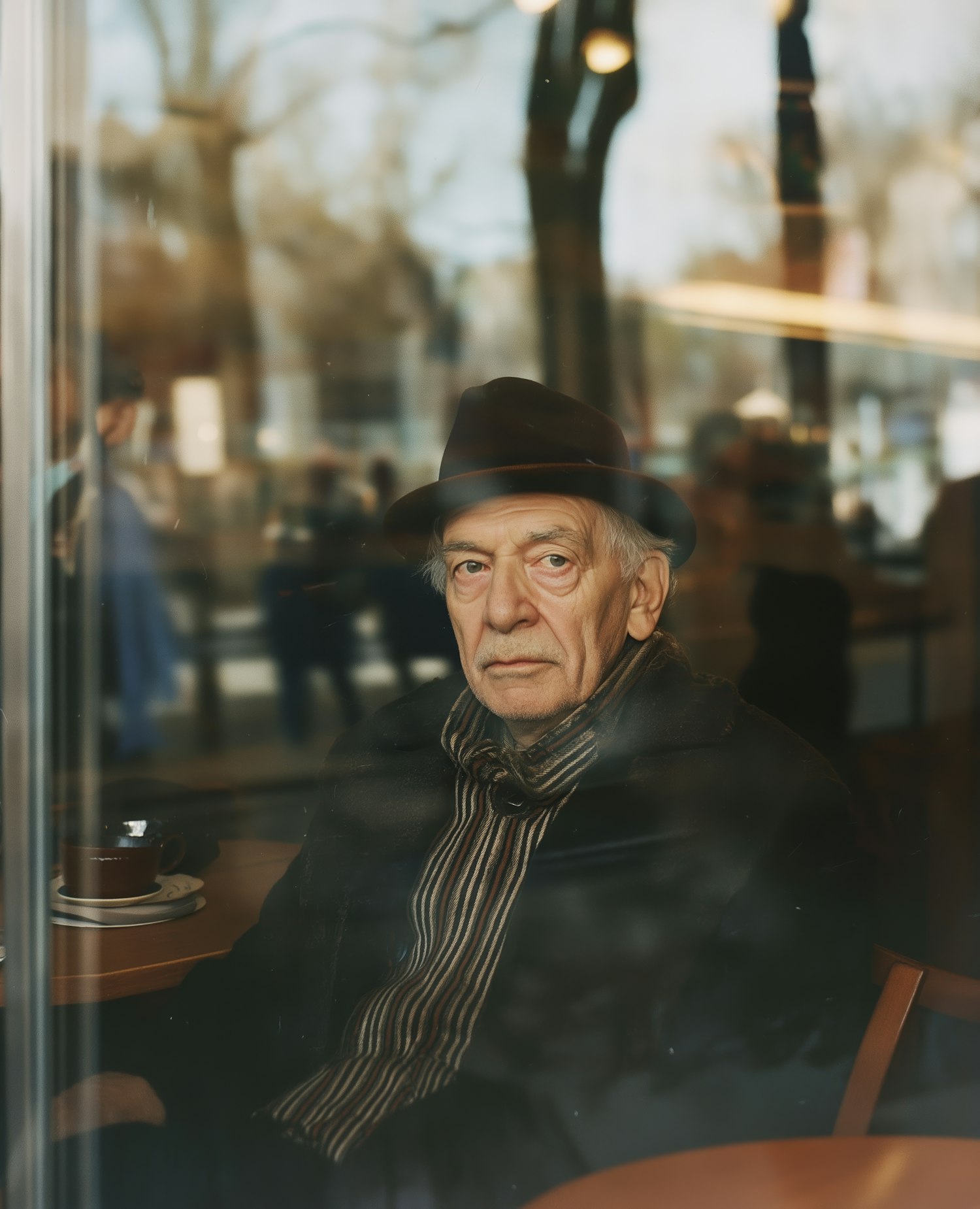 An elderly man in a café, wearing a dark coat and hat, gazes thoughtfully through a window, with a coffee cup on the table.