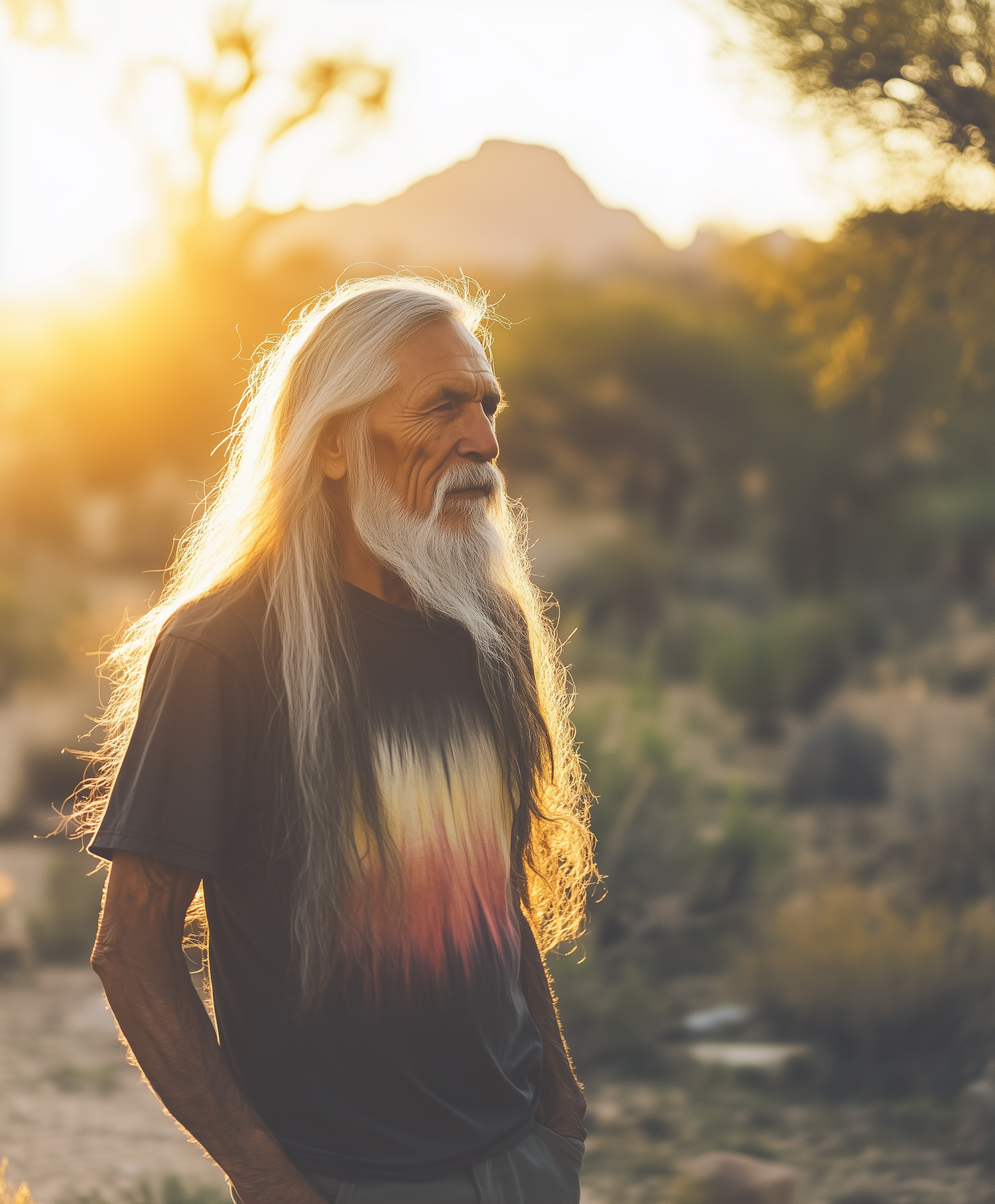 Elderly man with long white hair and beard in a desert sunset, wearing a gradient t-shirt. Sunlight creates a halo effect around him.