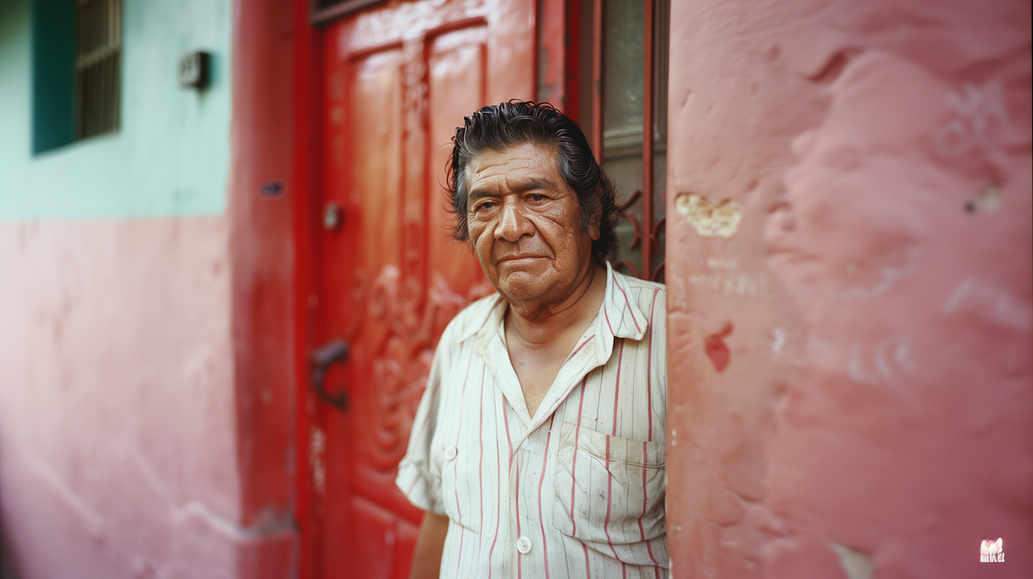 Older Hispanic man with wavy hair stands in a colorful doorway, wearing a striped shirt. Calm expression against a vibrant red and teal background.