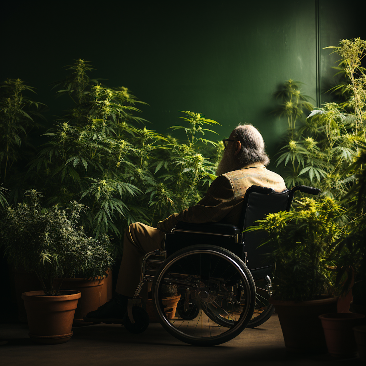 Elderly man in wheelchair surrounded by lush cannabis plants, creating a serene and contemplative atmosphere.
