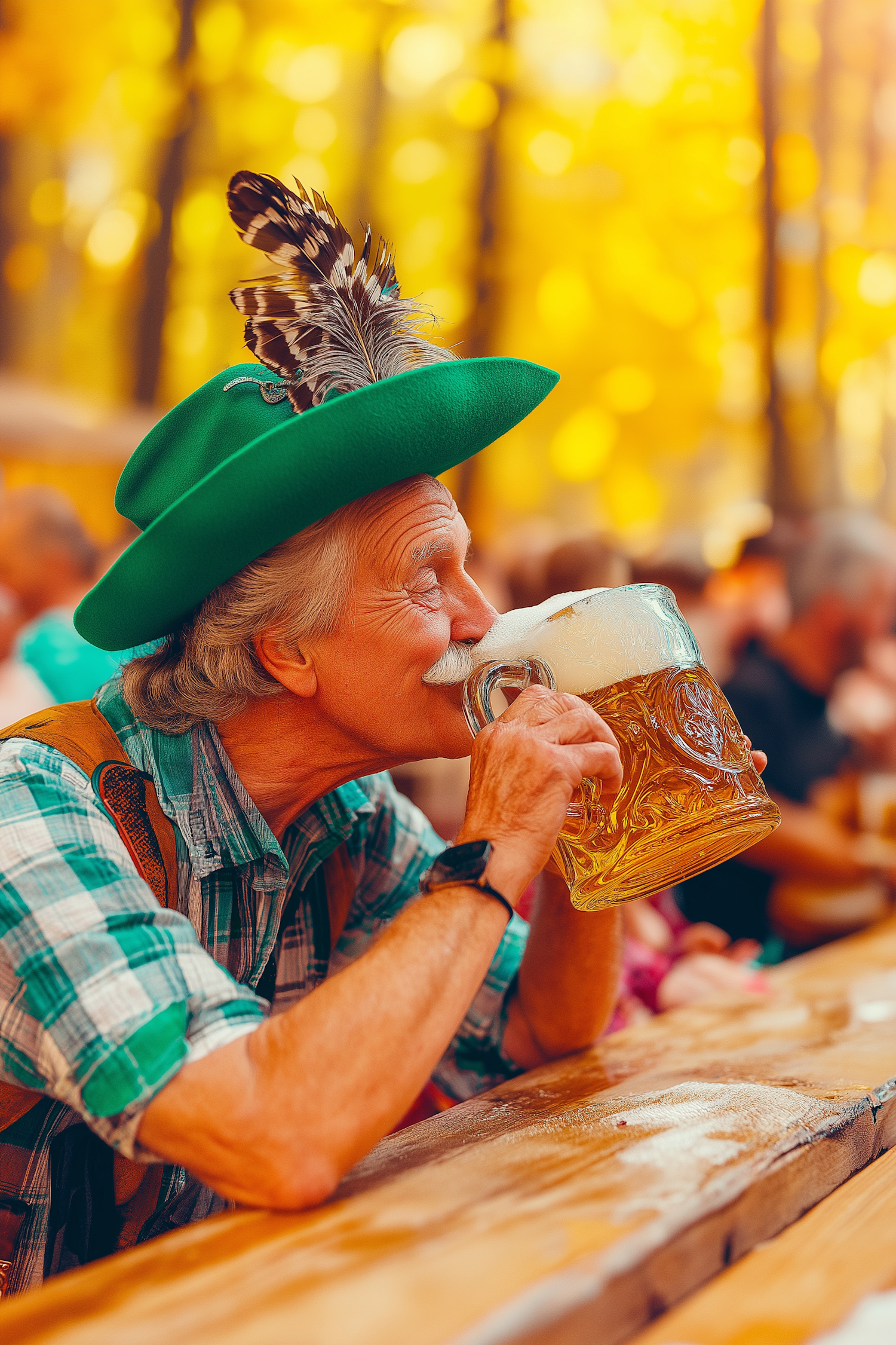 Elderly man in Bavarian attire enjoying beer at an outdoor autumn festival, surrounded by golden foliage and festive ambiance.
