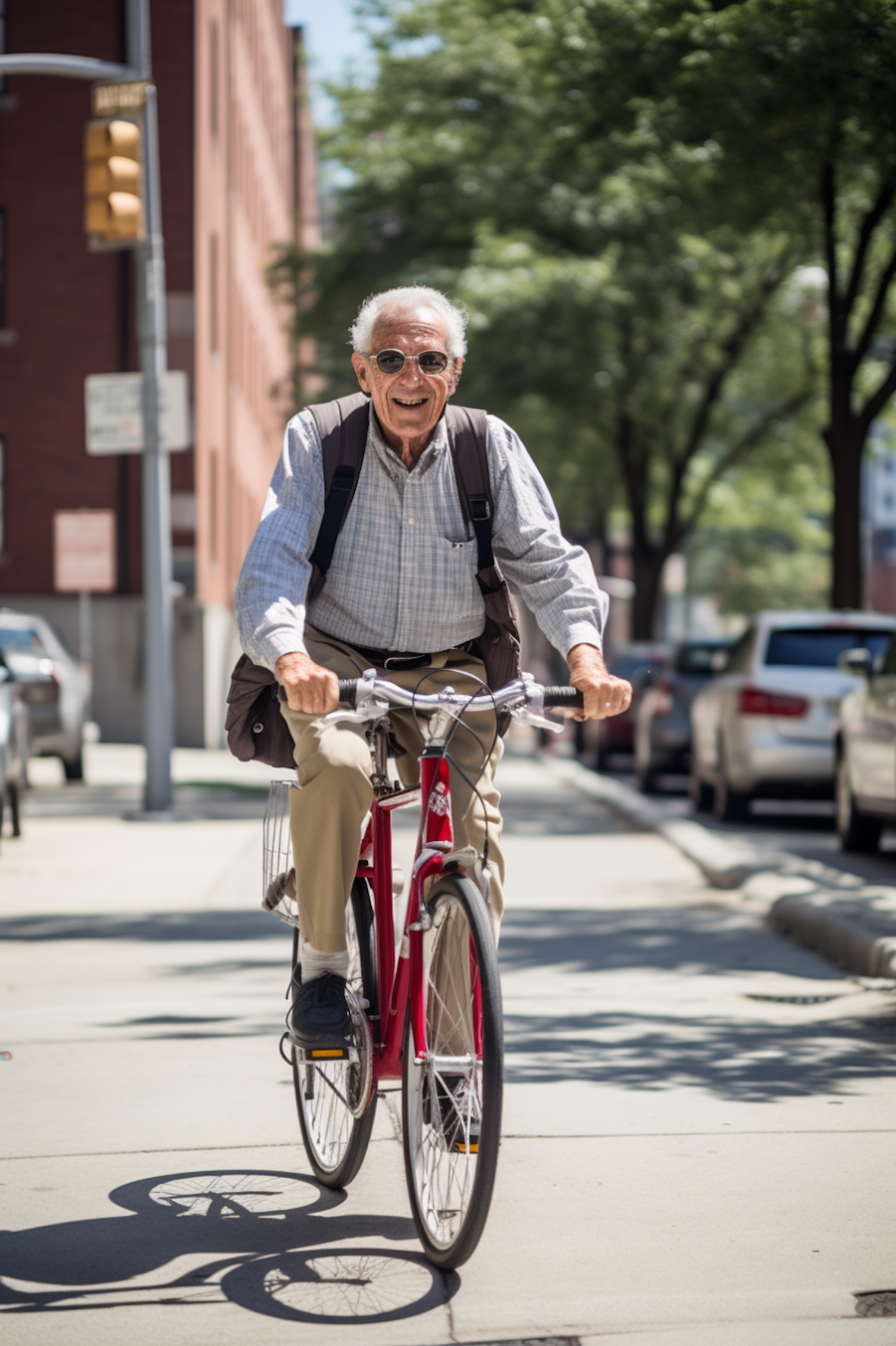 Elderly man joyfully cycling on a sunny city street, wearing sunglasses and a backpack, surrounded by parked cars and trees.