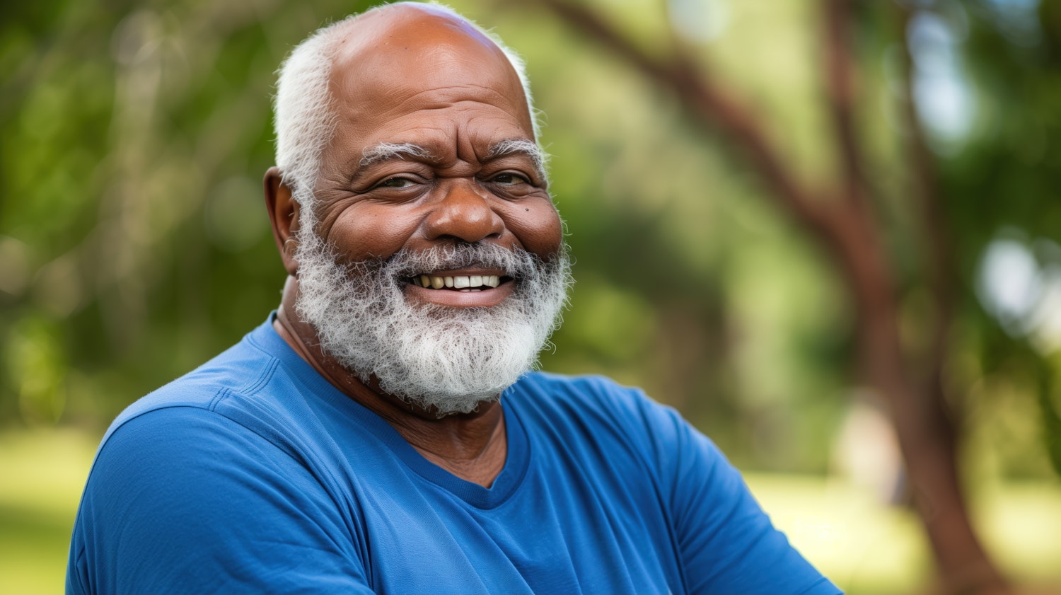 Elderly Black man with a white beard smiling warmly in a lush green park, wearing a blue shirt. Sunlight filters through the trees.