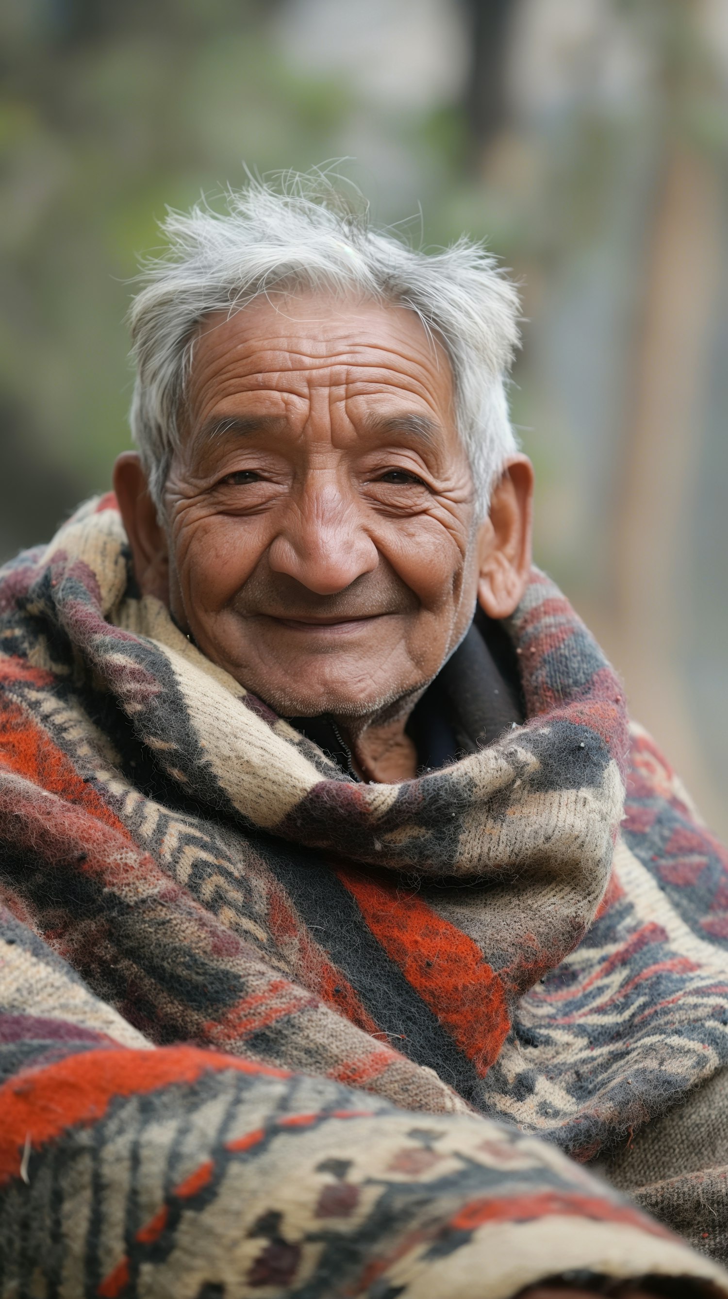 Elderly man with a warm smile, wrapped in a colorful woolen blanket with geometric patterns, set against a softly blurred outdoor background.