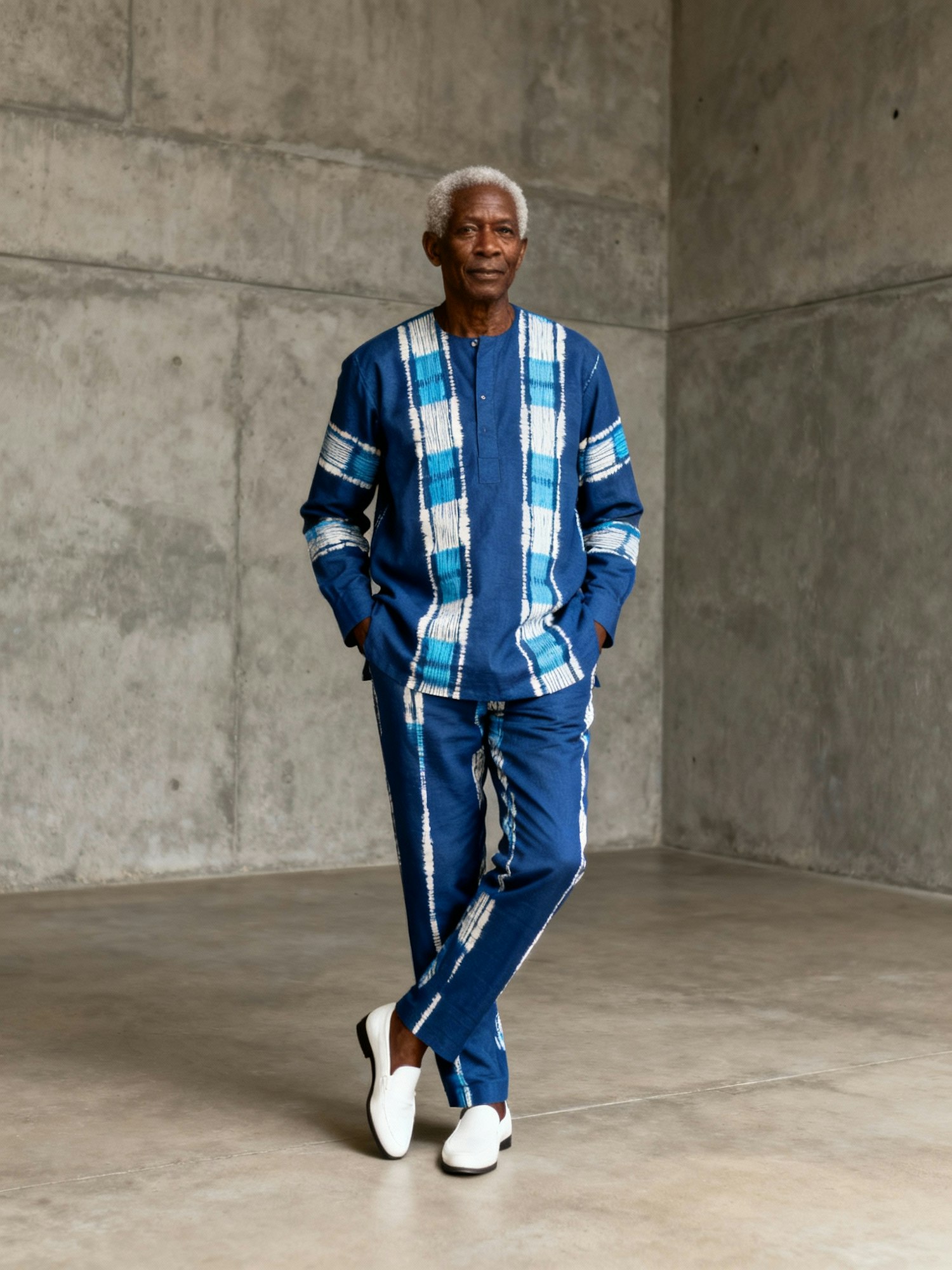Full-body, high-definition portrait of an older Black individual standing confidently in a minimalist concrete interior. They wear a matching blue ensemble consisting of a long-sleeved shirt and tailored trousers, adorned with vertical and horizontal white and pale blue patterns inspired by traditional African textiles such as adire or woven strip cloth. The outfit is structured yet relaxed, with clean lines and cultural depth. Pose & Expression: They stand with hands in pockets, one leg slightly bent, shoulders relaxed. Their gaze is directed forward with quiet confidence, conveying wisdom, composure, and personal pride. The posture is grounded and self-assured, offering a dignified presence that anchors the composition. Styling: The outfit’s rhythmic patterning creates visual harmony, while crisp white shoes add a contemporary contrast. Accessories are minimal or absent, allowing the textile and silhouette to take center stage. The styling balances tradition with editorial clarity. Setting & Mood: The background features textured gray concrete walls and a smooth concrete floor, creating a modern, architectural atmosphere that enhances the warm, earthy tones of the outfit. Soft, directional lighting casts gentle shadows that emphasize the folds of the garment and the emotional nuance of the pose. The overall mood is contemplative, sculptural, and culturally rich—ideal for a fashion editorial or visual archive celebrating modest African fashion and generational style.