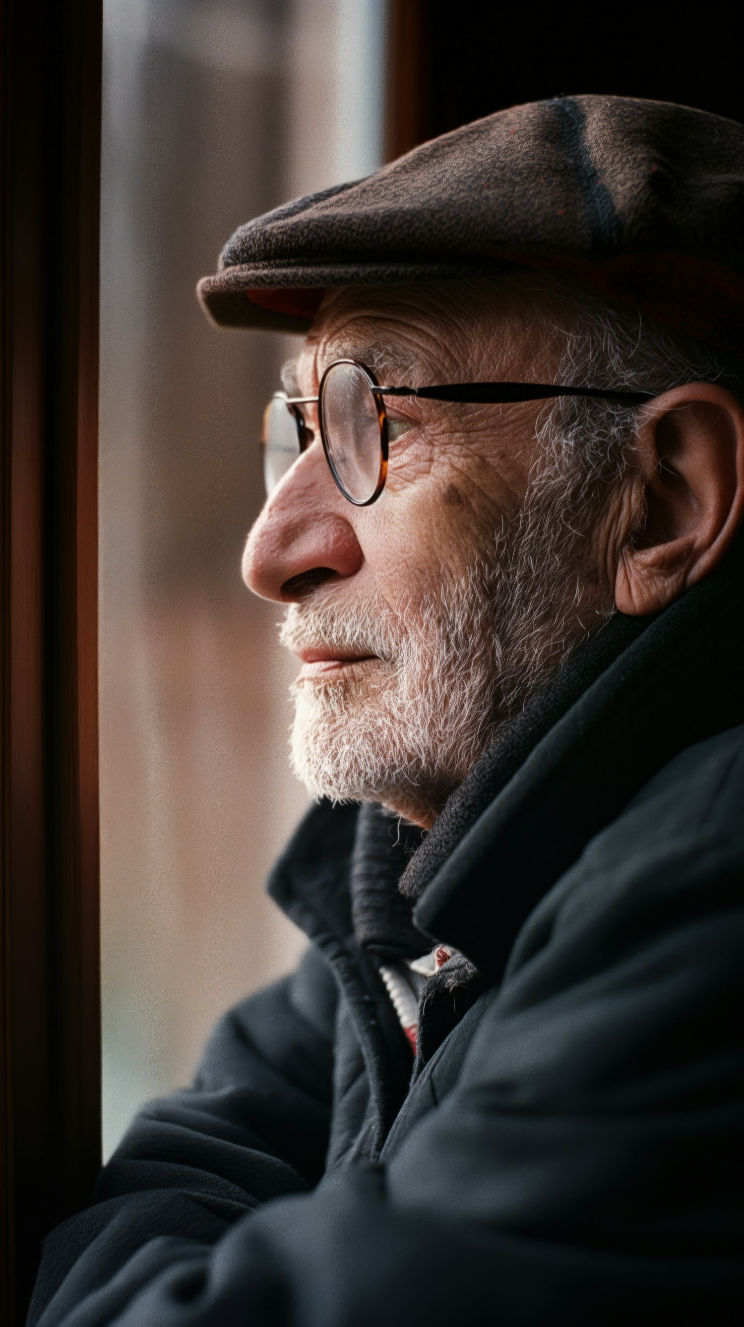 Elderly man in a flat cap and glasses gazes thoughtfully out a window, bathed in soft light, wearing a dark coat.