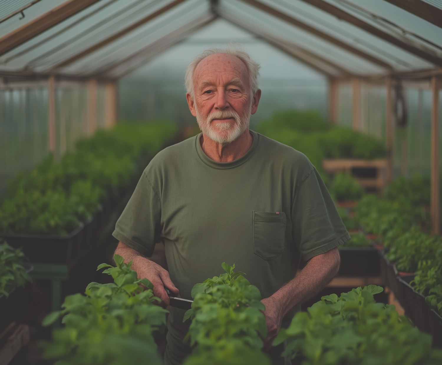 Elderly man in a greenhouse tending to lush green plants, wearing a green t-shirt and holding a gardening tool.
