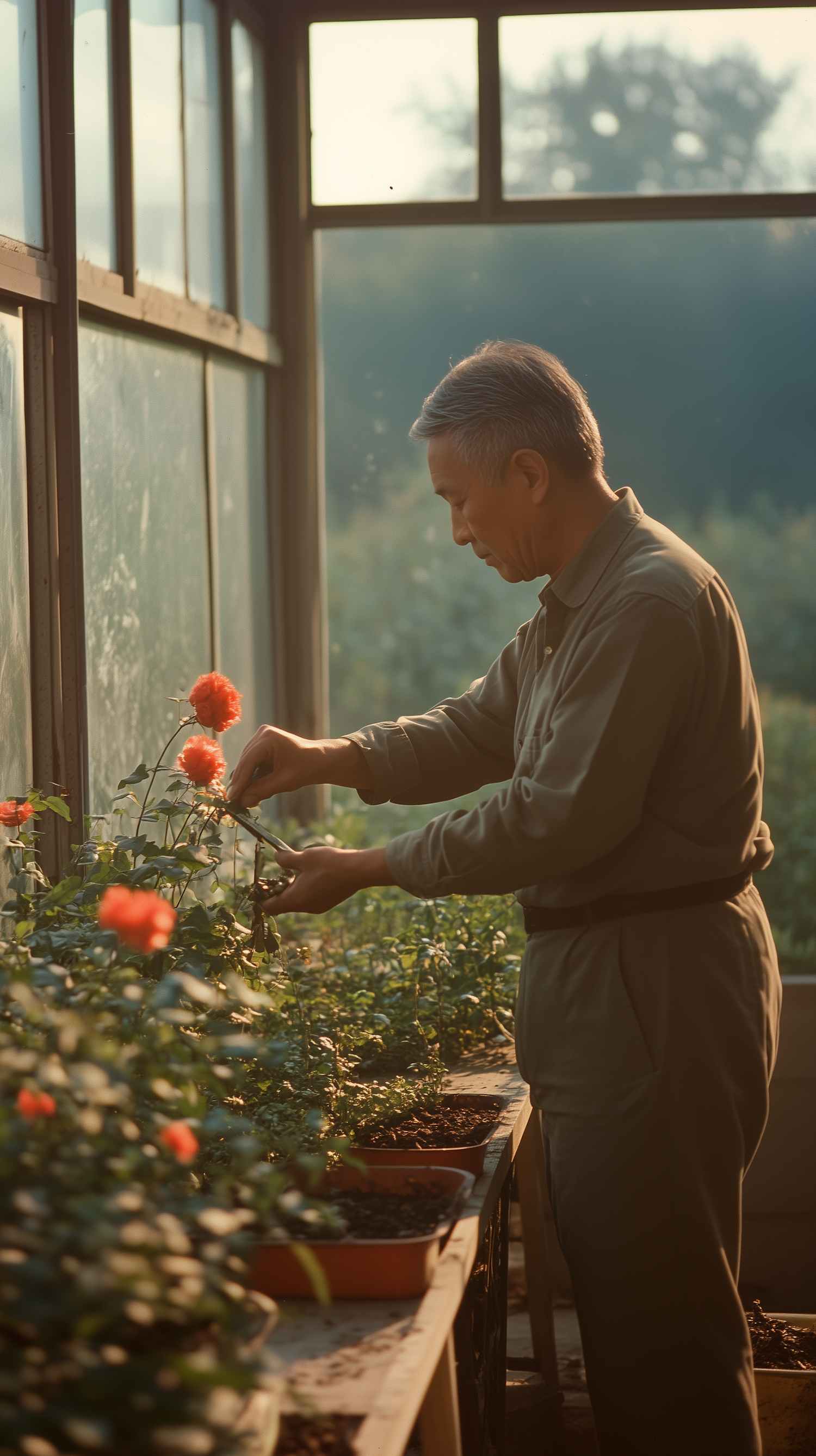 Elderly man pruning red flowers in a sunlit greenhouse, surrounded by lush greenery and potted plants.