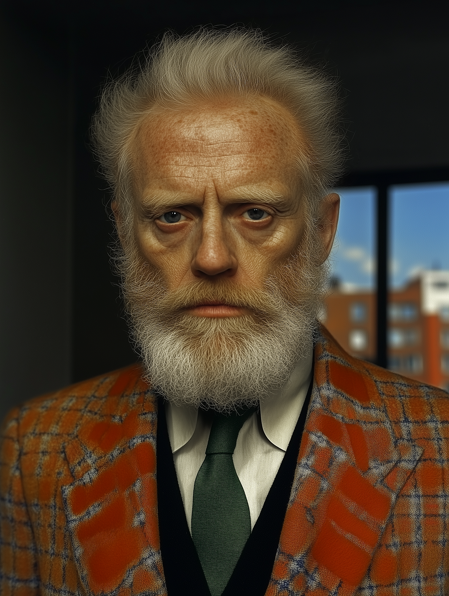 Elderly man with white beard in orange plaid jacket and green tie, standing in dim room with window view of building and blue sky.