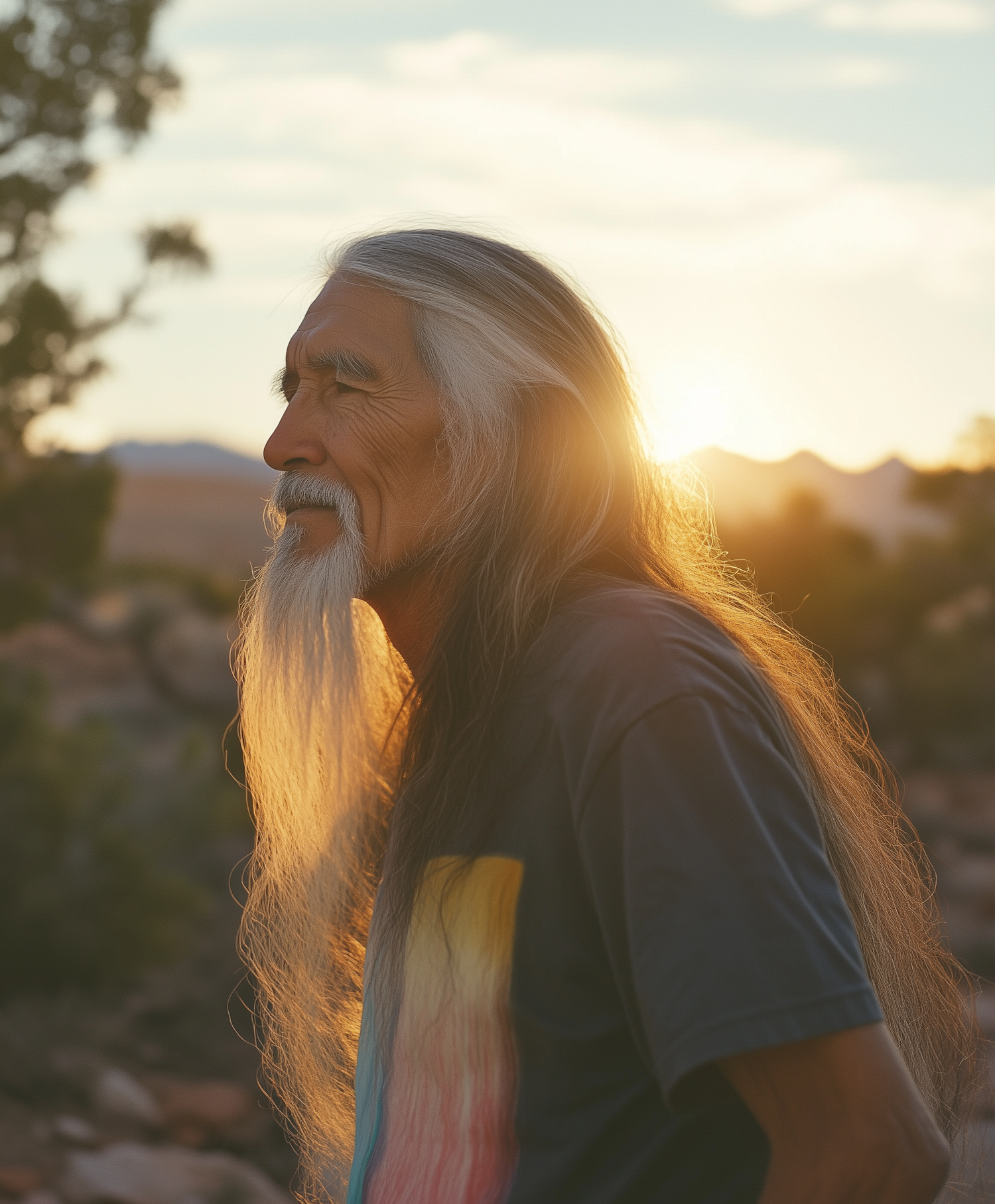 Elderly man with long gray hair and beard in sunset, wearing a dark t-shirt with colorful design, serene expression, natural backdrop.