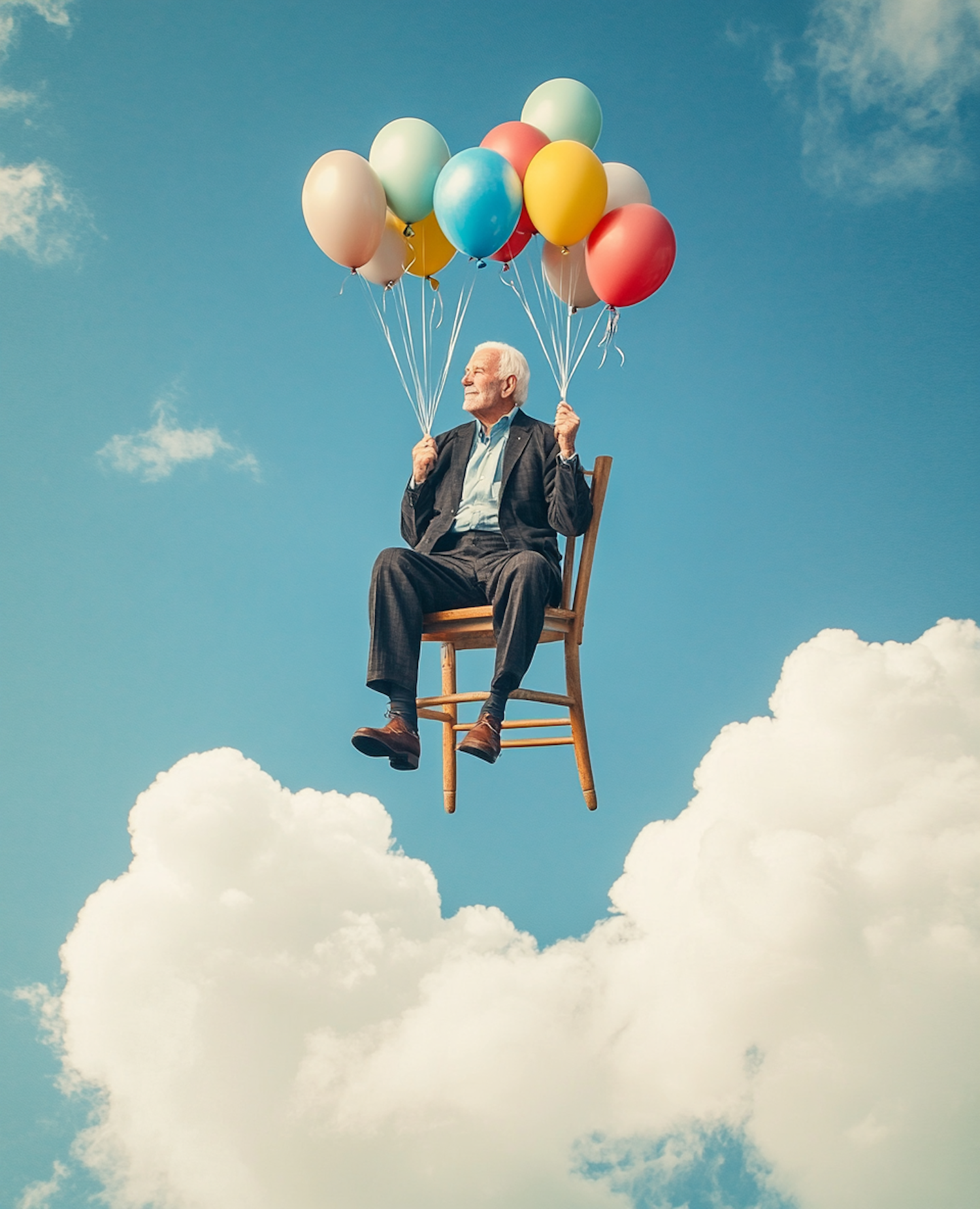 Elderly man in a suit floats in the sky on a chair with colorful balloons, surrounded by fluffy clouds and a bright blue sky.