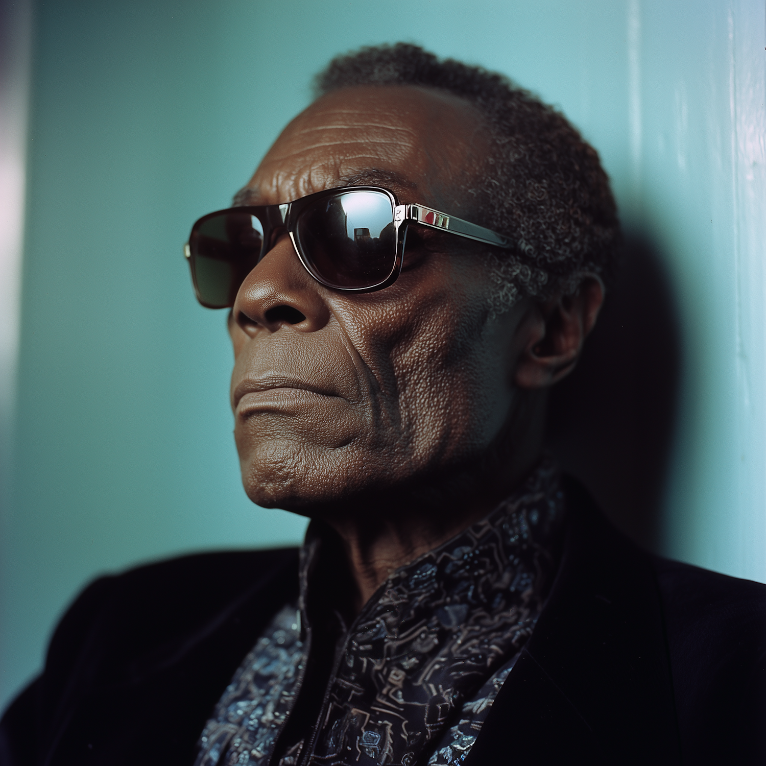 Elderly Black man with sunglasses, deep brown skin, and gray hair, exuding wisdom and elegance against a teal background.