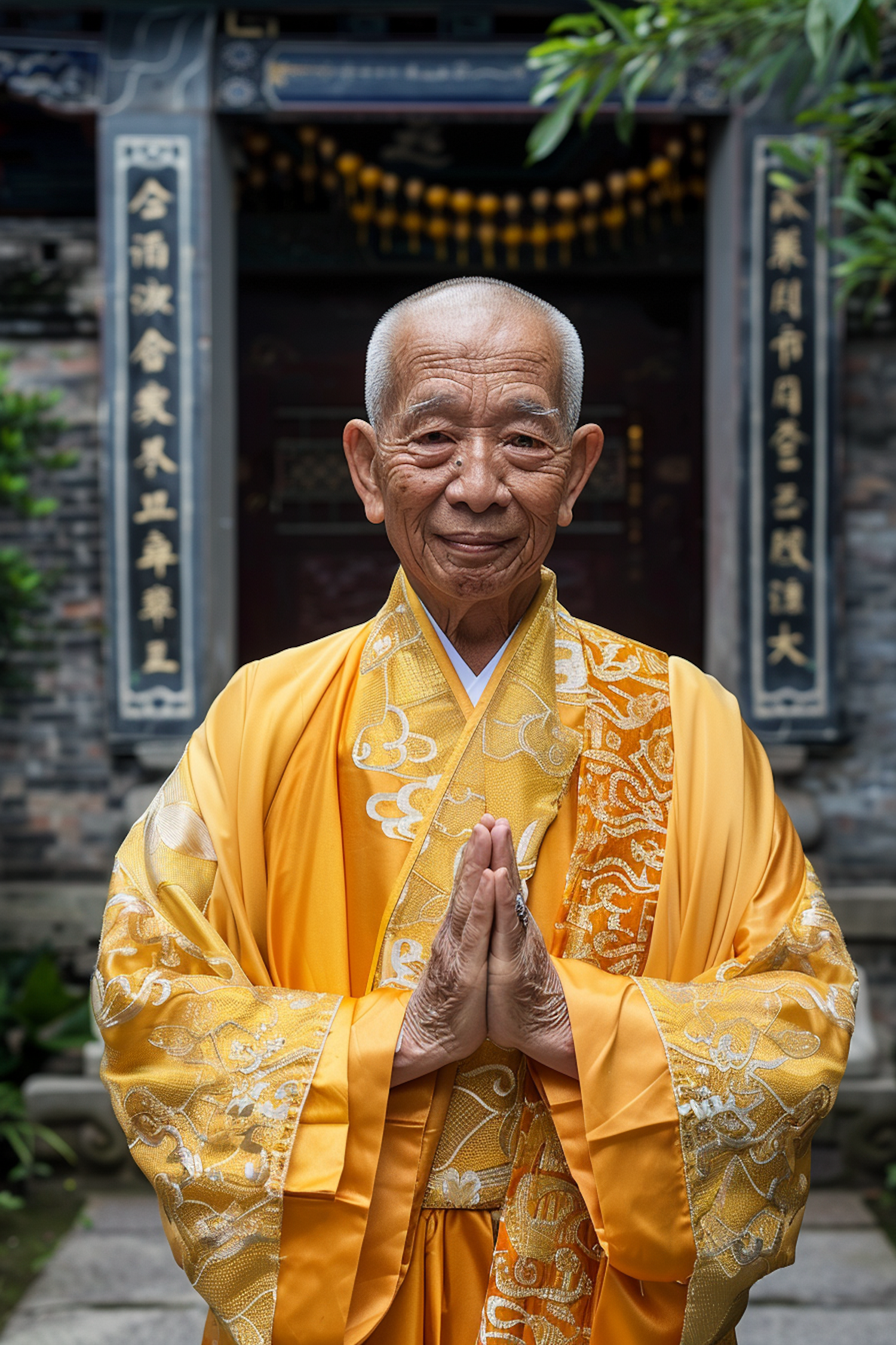Elderly Asian man in golden robe, hands in prayer, stands before traditional building with Chinese characters, surrounded by greenery.