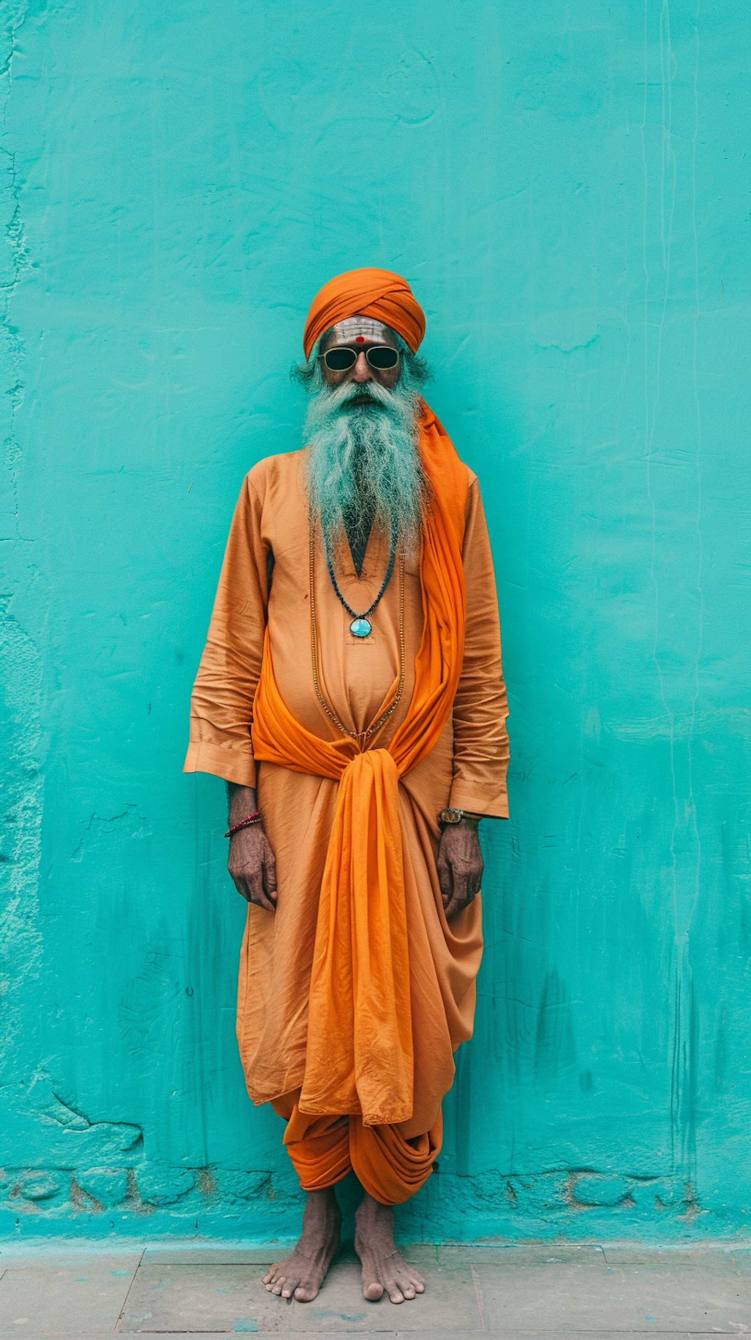 Elderly man in orange robe and turban stands against a turquoise wall, wearing sunglasses and a necklace, exuding calm and wisdom.