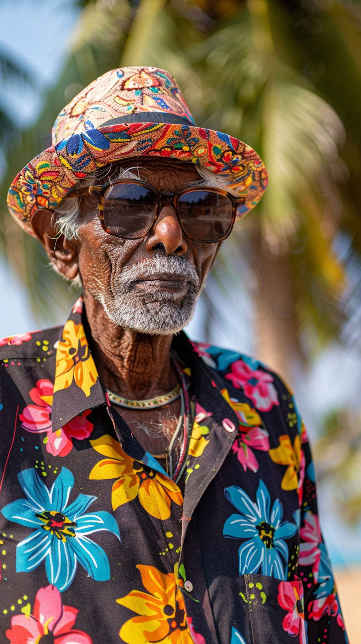 Elderly man in vibrant floral shirt and colorful hat, wearing sunglasses, with a tropical background of palm leaves.