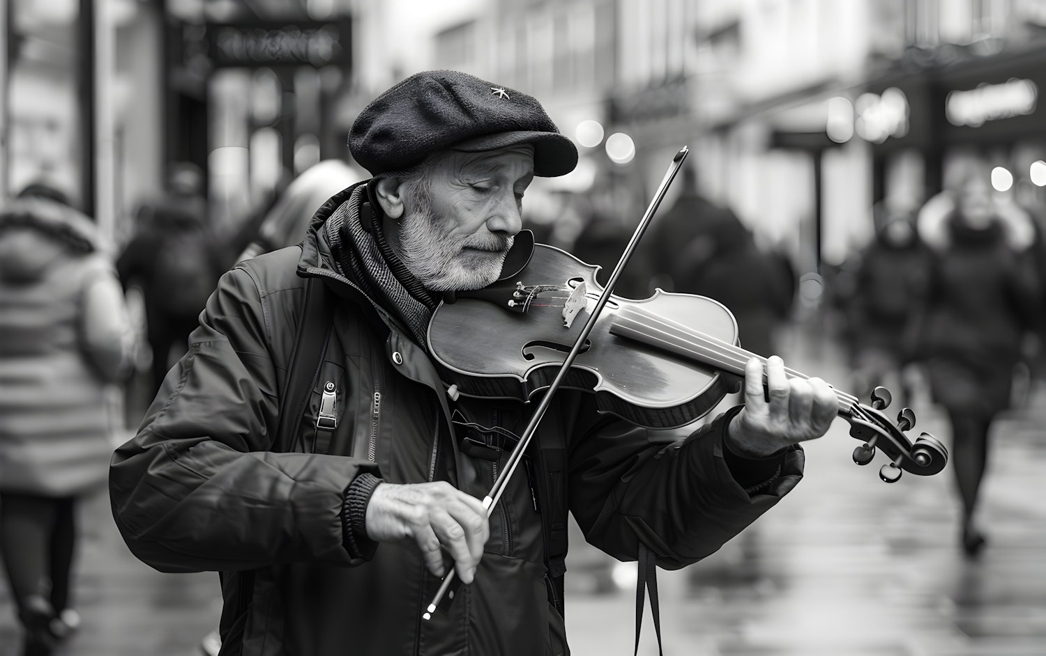 Elderly man playing violin on a busy street, wearing a beret and jacket. Monochrome image with blurred background of pedestrians.