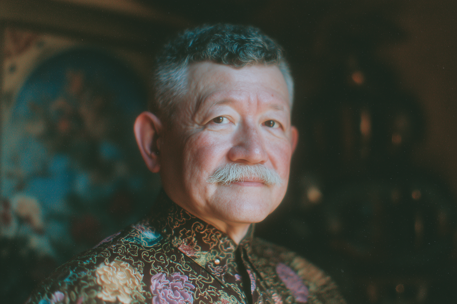 A distinguished older man in a patterned traditional outfit, captured in warm lighting with a soft-focus background.