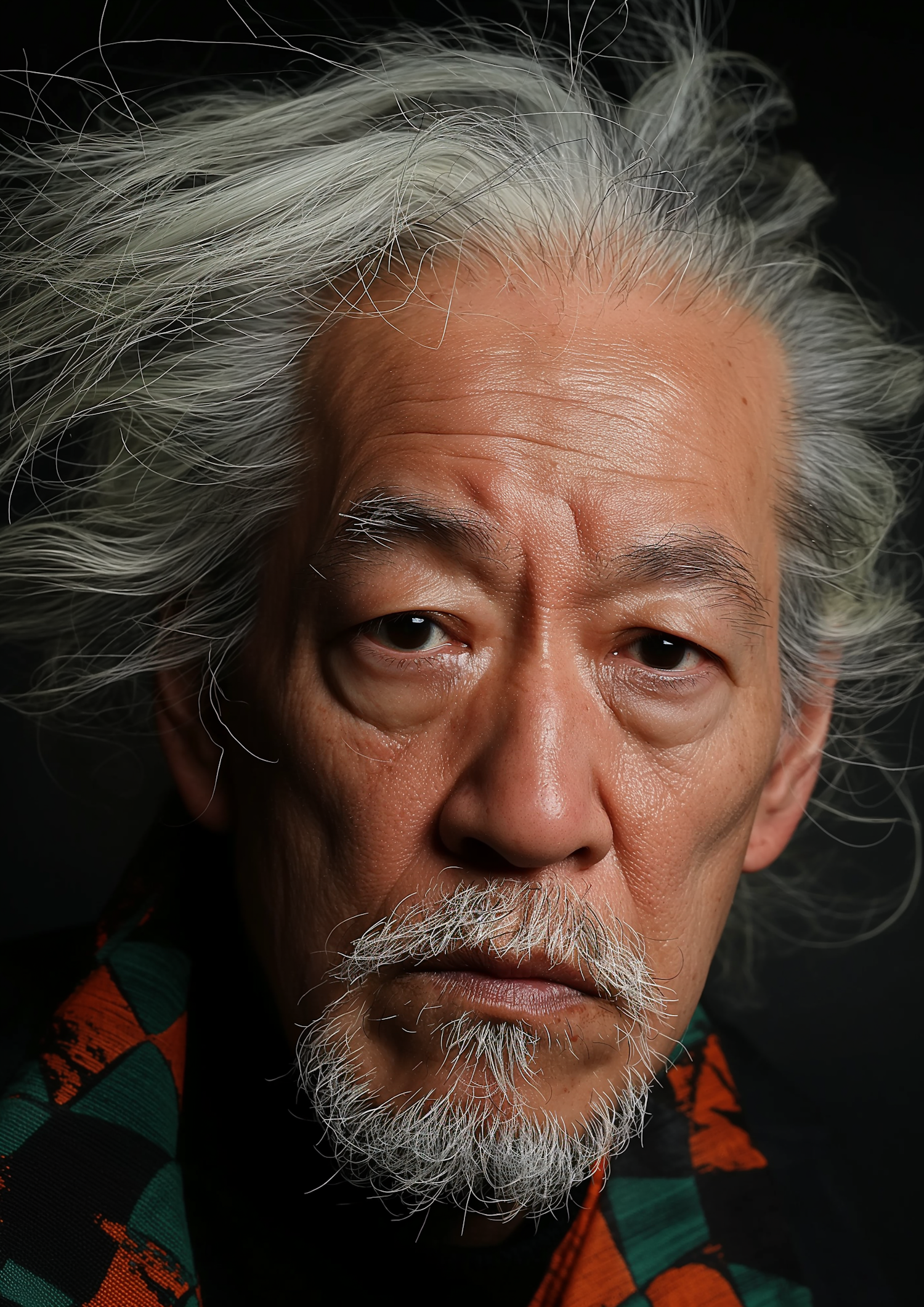 Close-up of an elderly Asian man with white hair and beard, wearing a colorful scarf, against a dark background.
