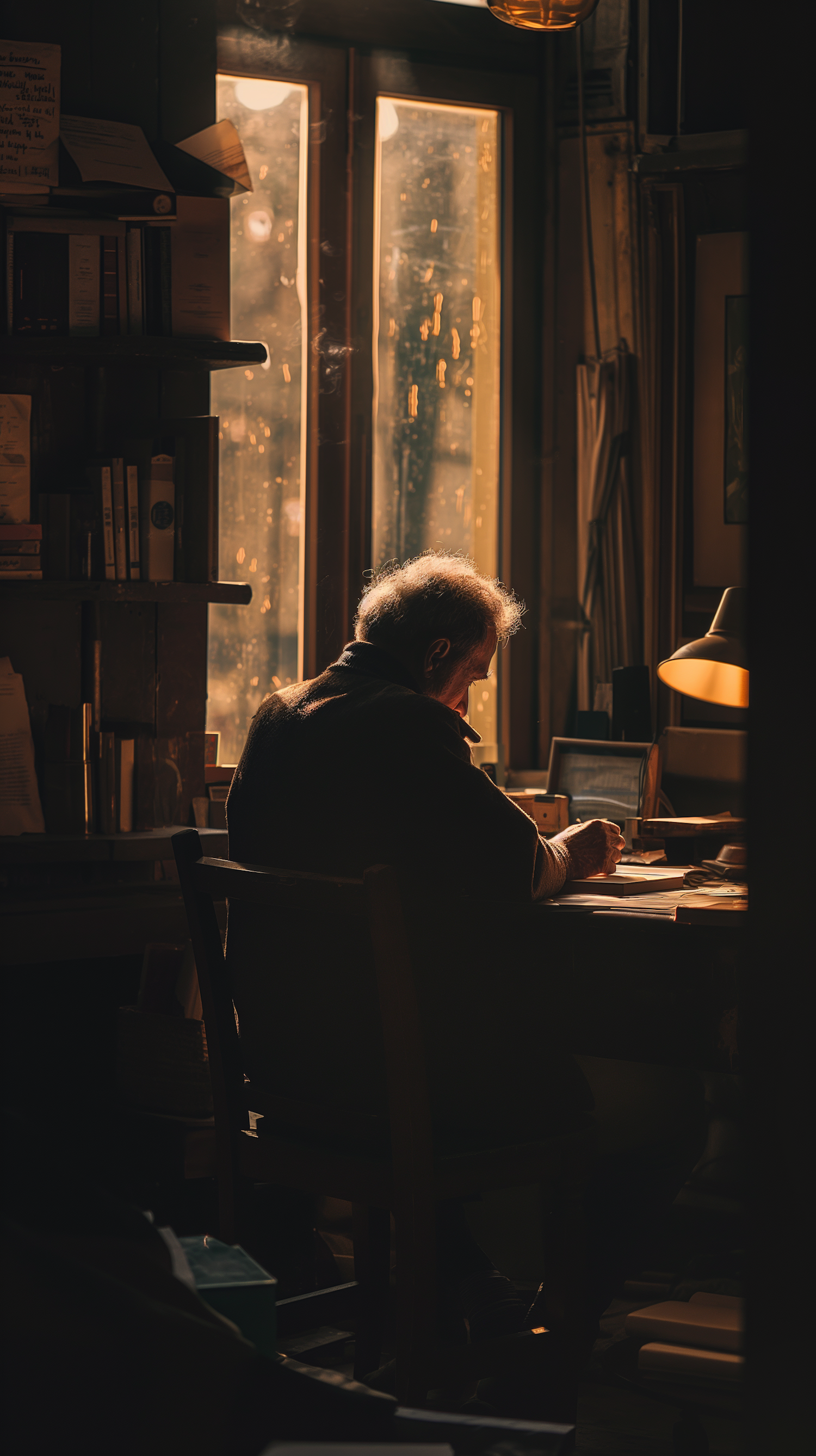Elderly man writing at a desk in warm sunlight, surrounded by books and papers, creating a serene and contemplative atmosphere.