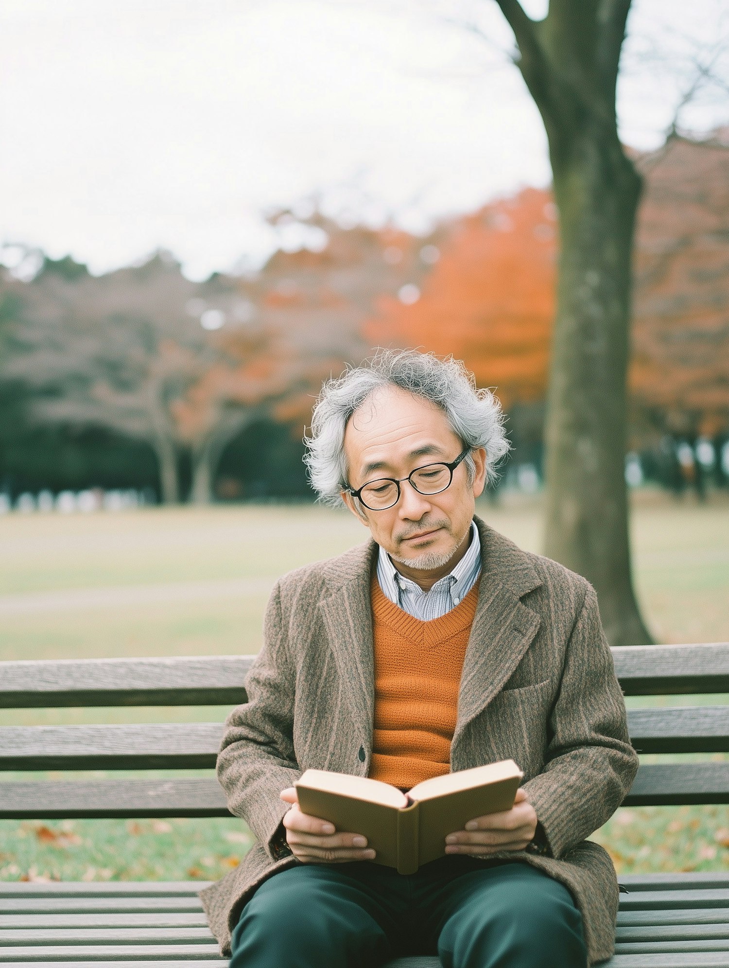 Elderly man reading on a park bench in autumn, wearing a brown coat and orange sweater, surrounded by colorful foliage.