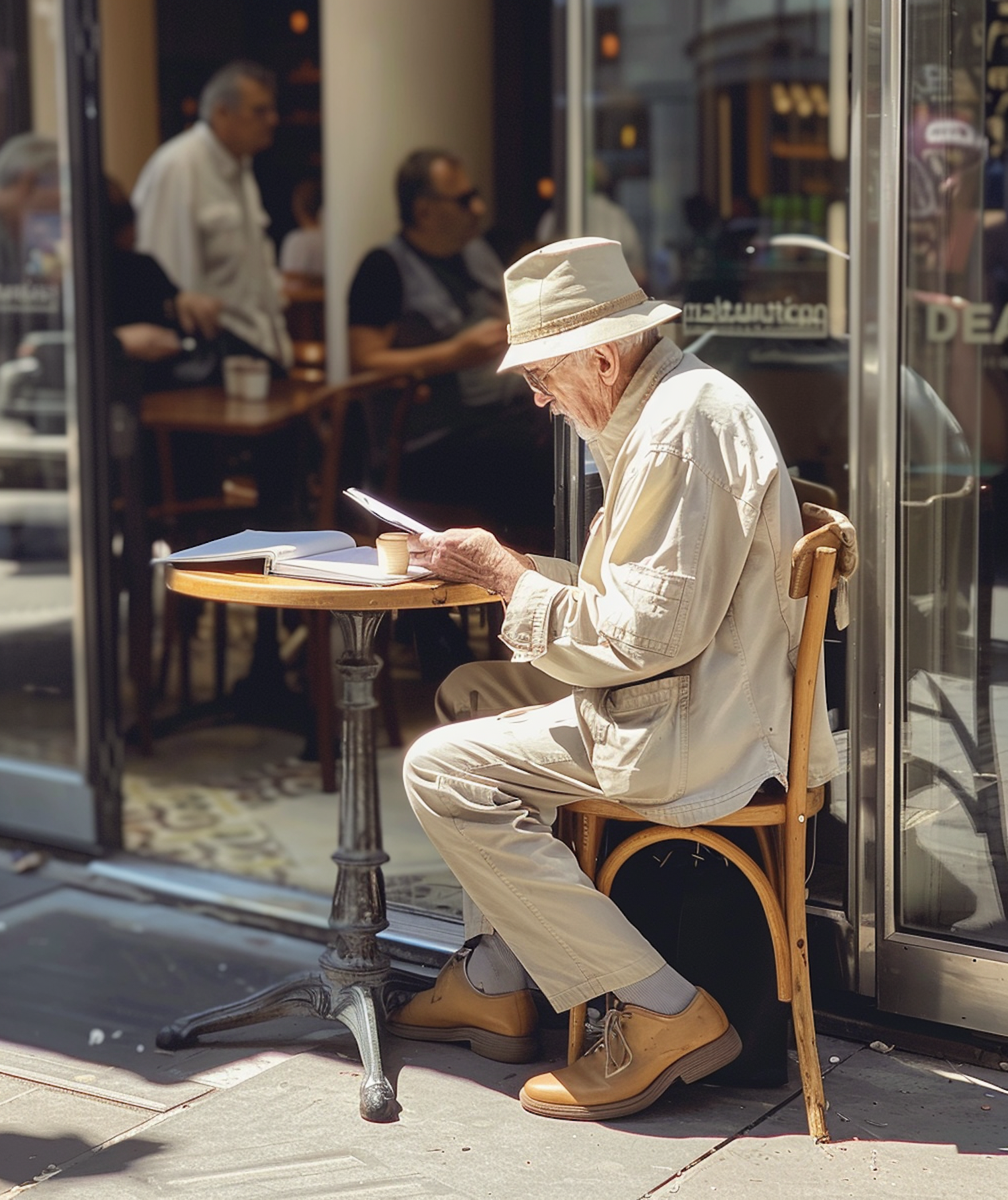 Elderly man in beige attire reading at a café table outdoors, with warm sunlight and a bustling café interior in the background.