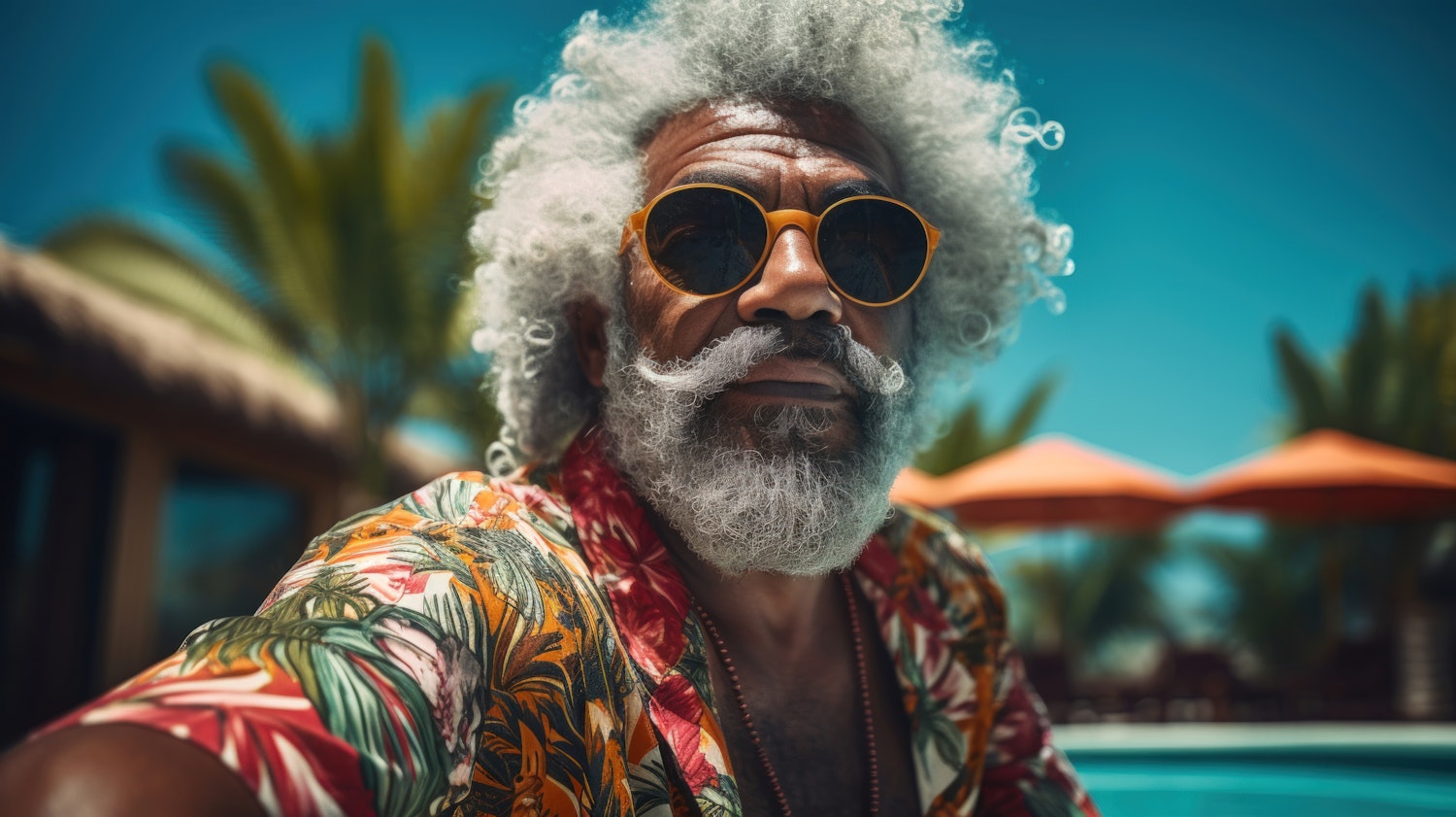 Stylish man with white hair and sunglasses by a pool, wearing a tropical shirt. Sunny day with palm trees in the background.