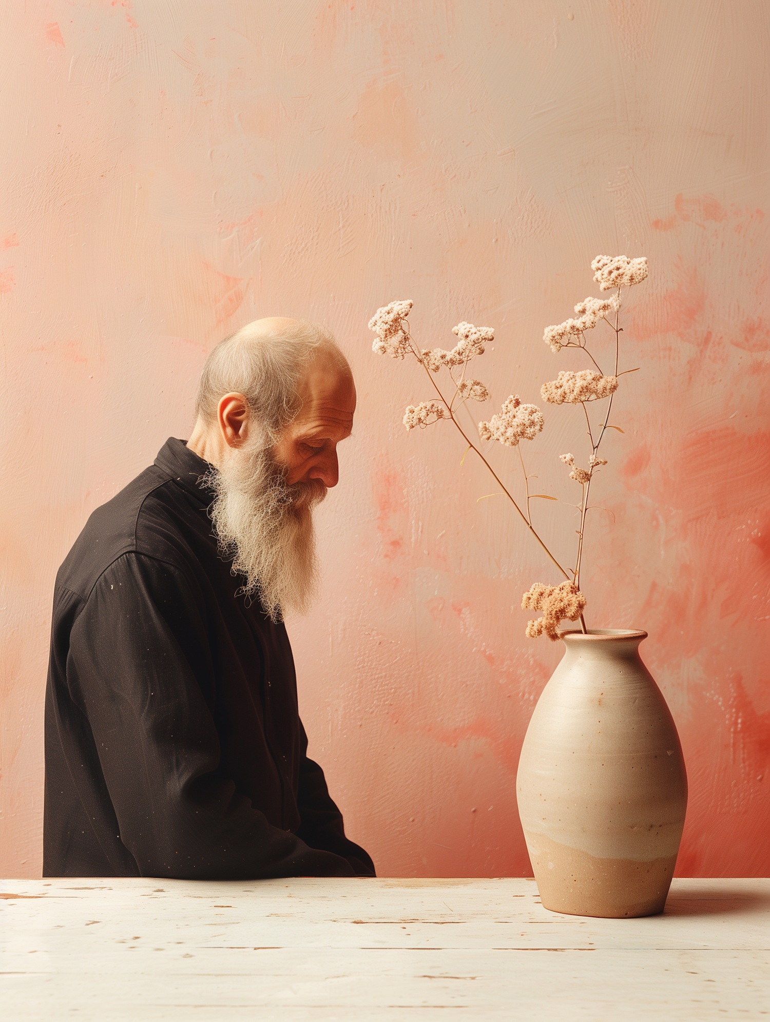 Elderly man with white beard in black shirt, seated by a vase with dried flowers against a pink textured wall.