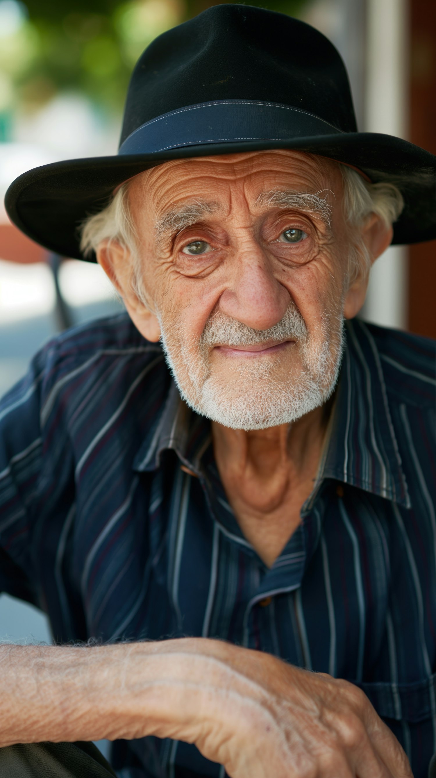 Elderly man with a black hat and white beard, wearing a striped shirt, sitting outdoors with a gentle expression.