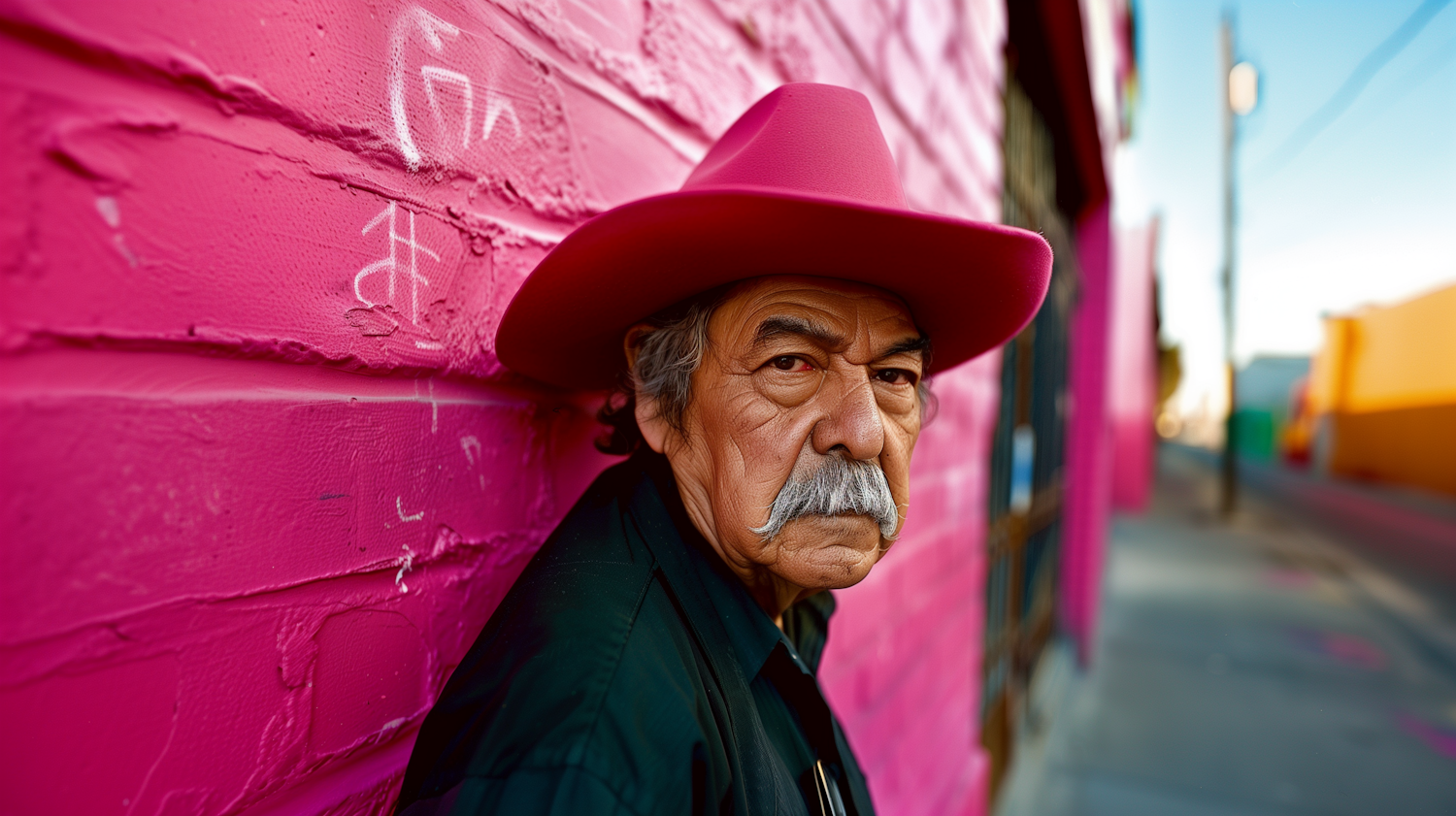 Older man in a pink cowboy hat against a vibrant pink wall, exuding a serious expression. Colorful urban background.