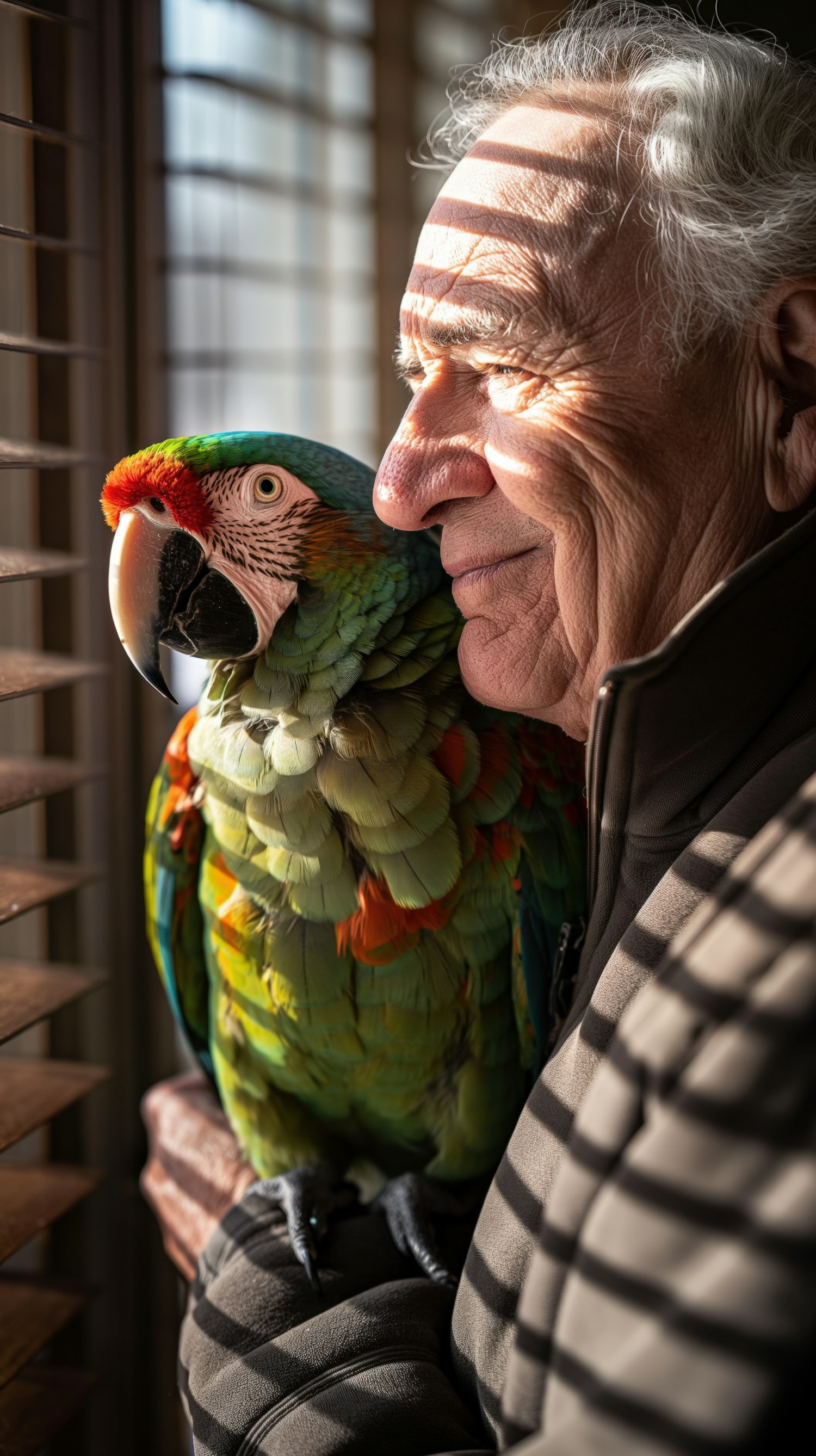 Elderly man with white hair holds a colorful parrot by a window, sunlight casting shadows, creating a serene and warm atmosphere.