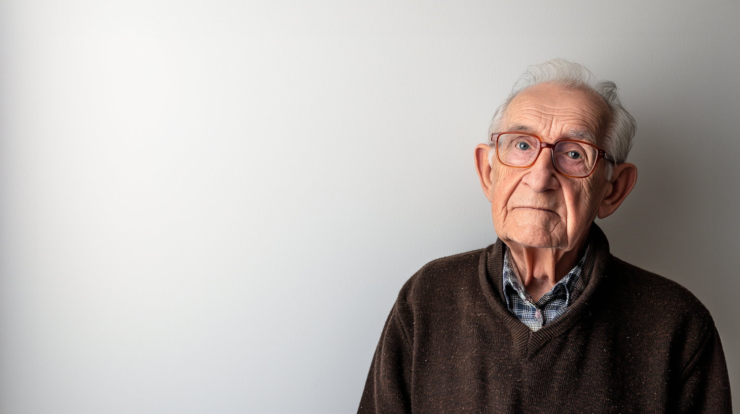 Elderly man with glasses and white hair in a brown sweater against a plain background, exuding a calm and contemplative expression.