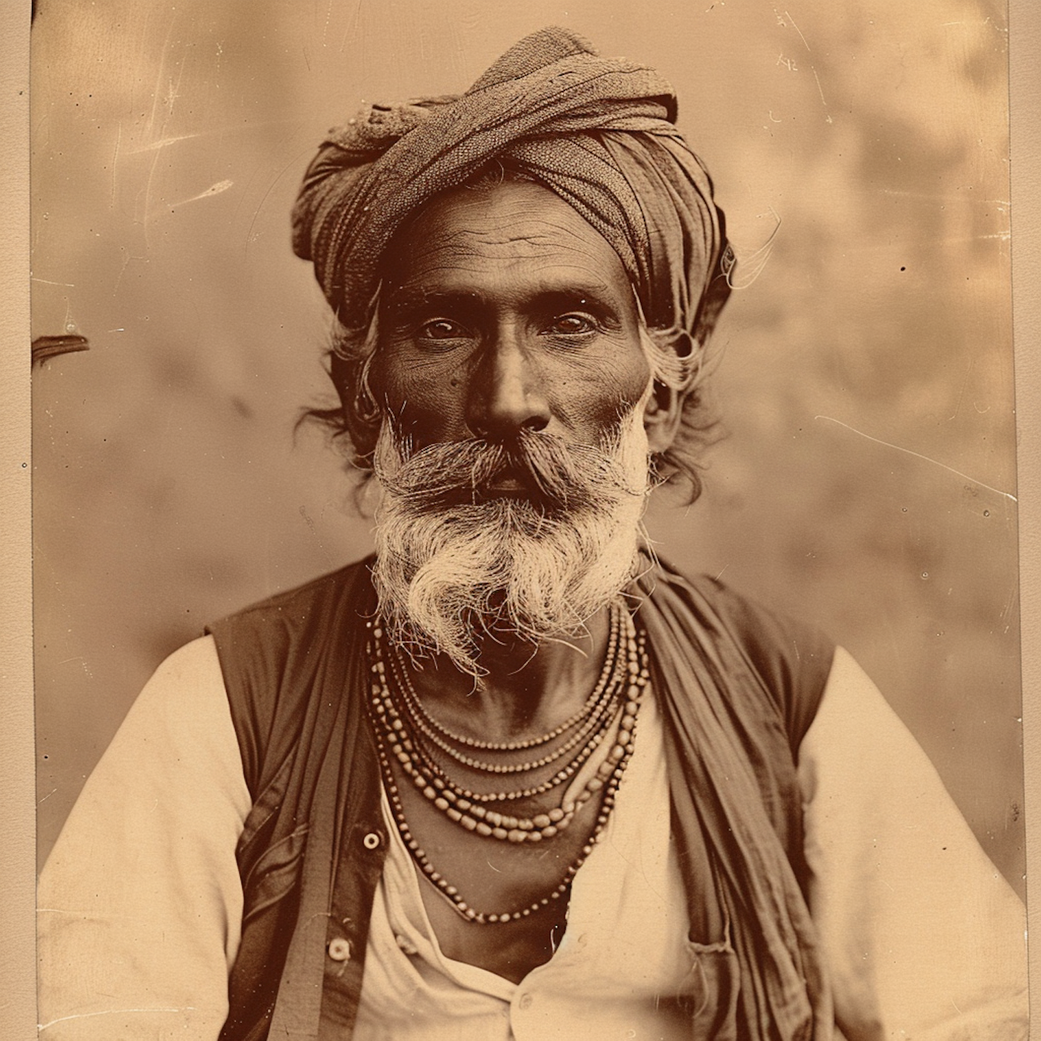 Elderly man with a white beard and turban, wearing beaded necklaces. His intense gaze and traditional attire evoke cultural richness.