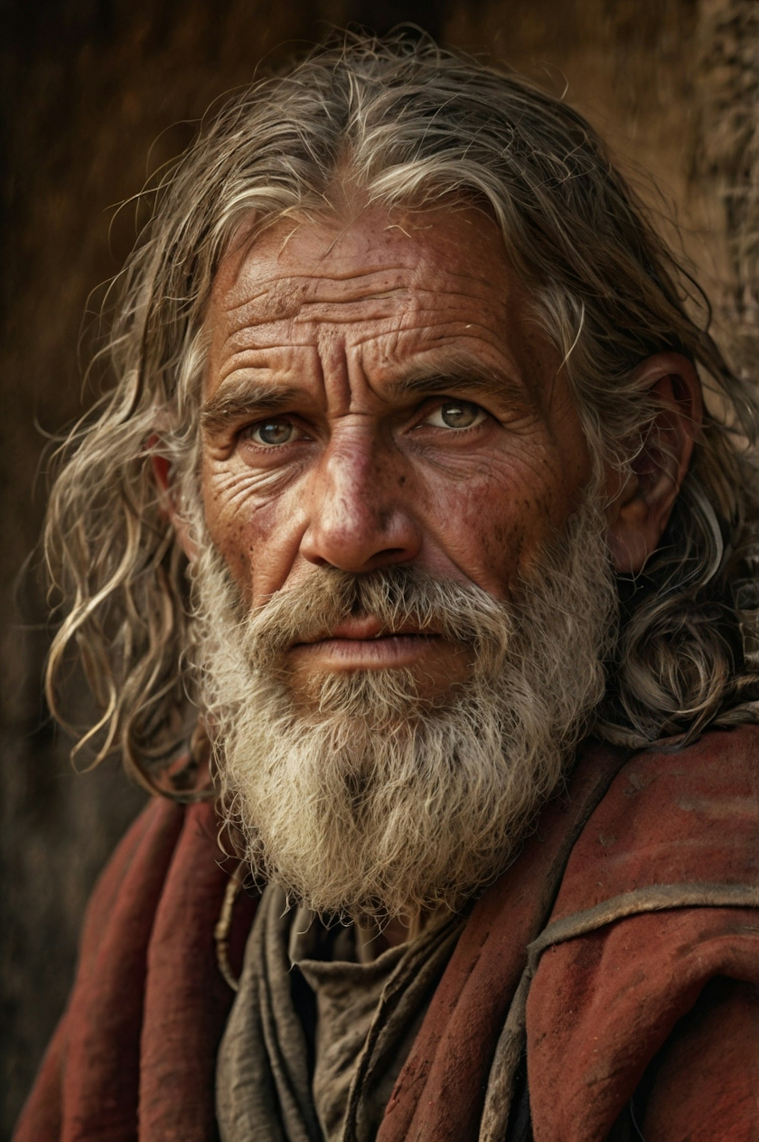 Elderly man with long gray hair and beard, wearing a brown cloak and red shawl, gazes intently with piercing blue eyes.