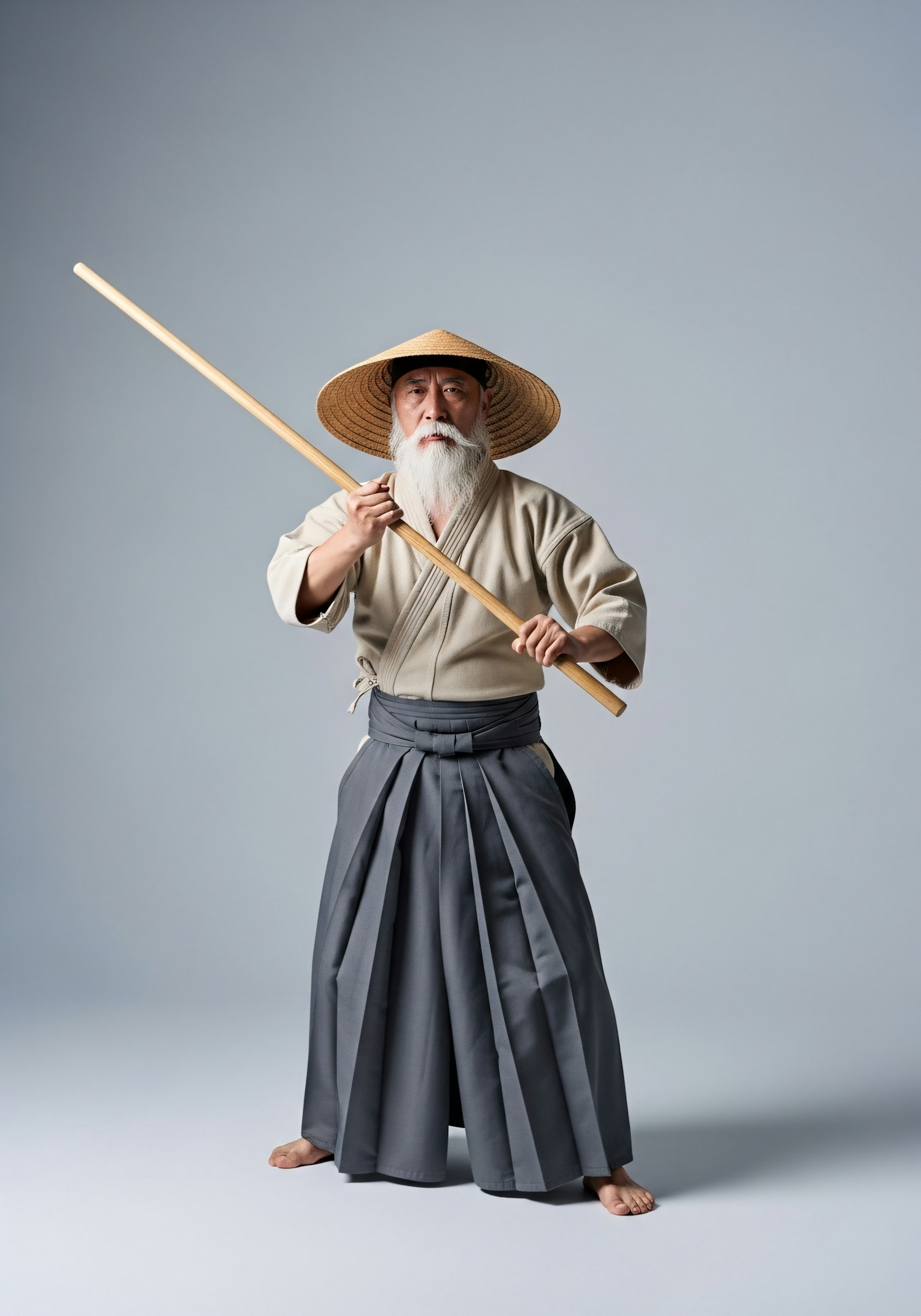 Elderly man in traditional Japanese attire holding a wooden staff, wearing a straw hat, against a neutral gray background.