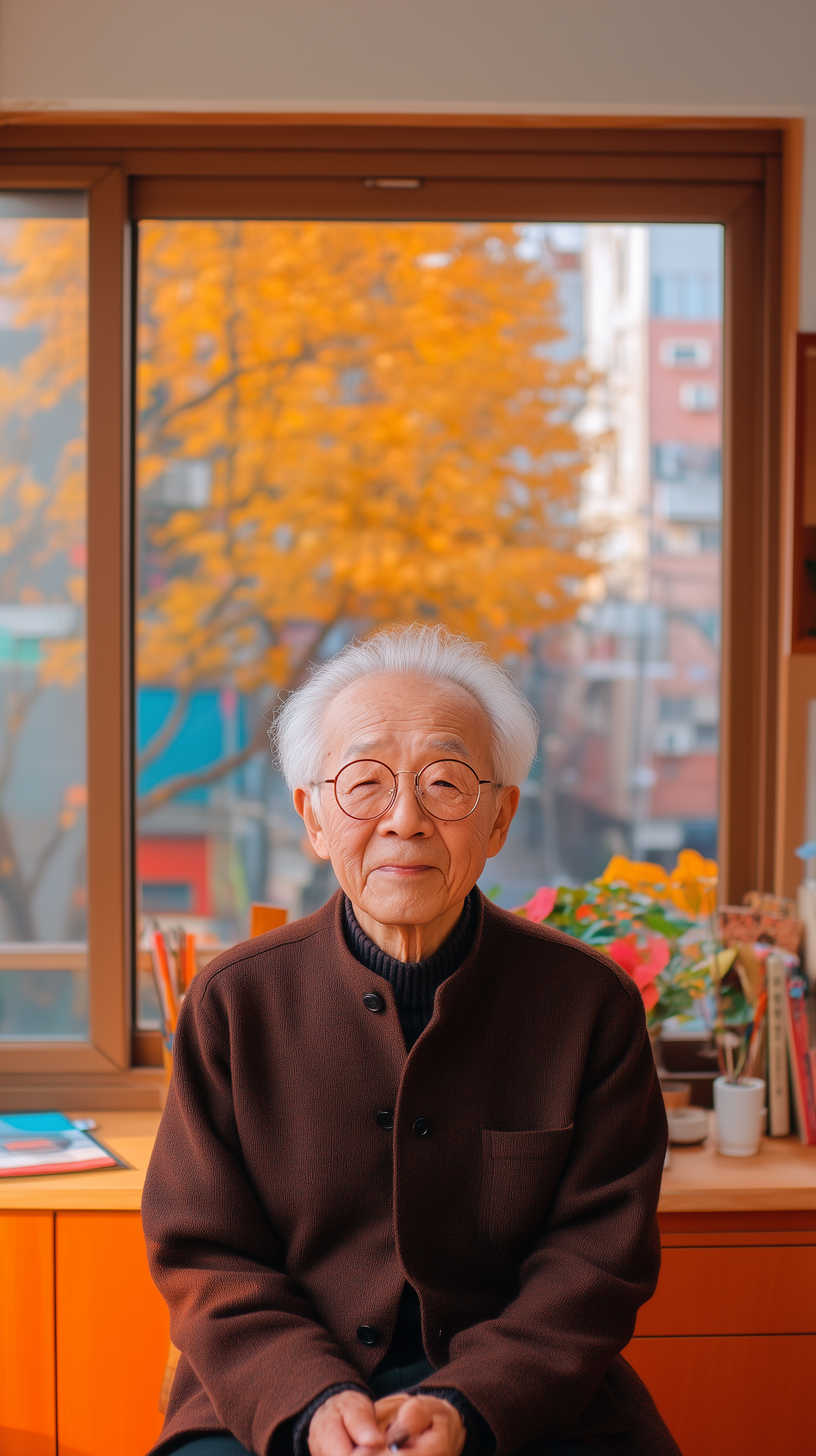 Elderly Asian man in a cozy room with autumn view, wearing glasses and a brown jacket, surrounded by books and plants.
