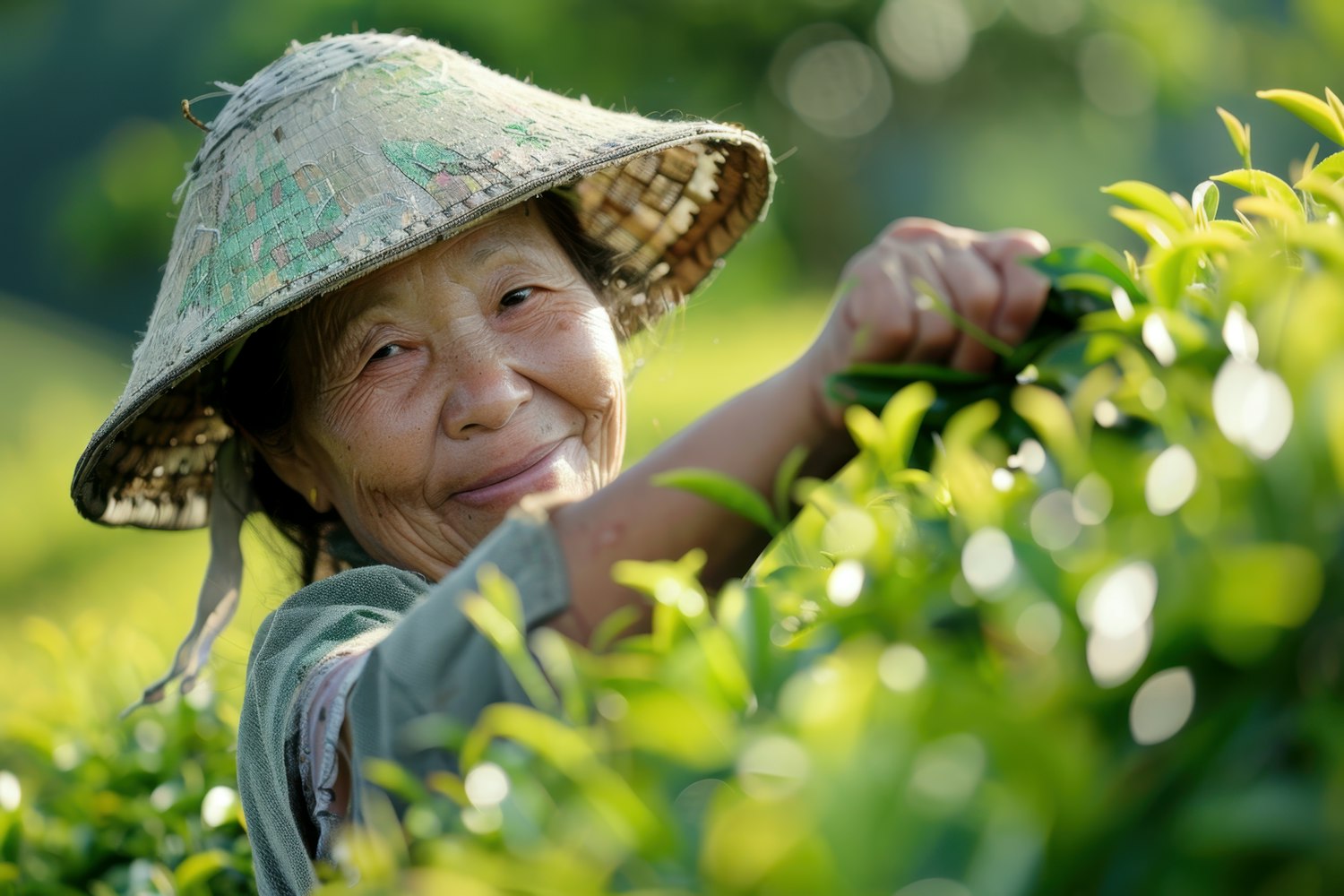 Elderly woman in a straw hat picking tea leaves in a lush green field, smiling warmly. Serene and natural setting with vibrant foliage.