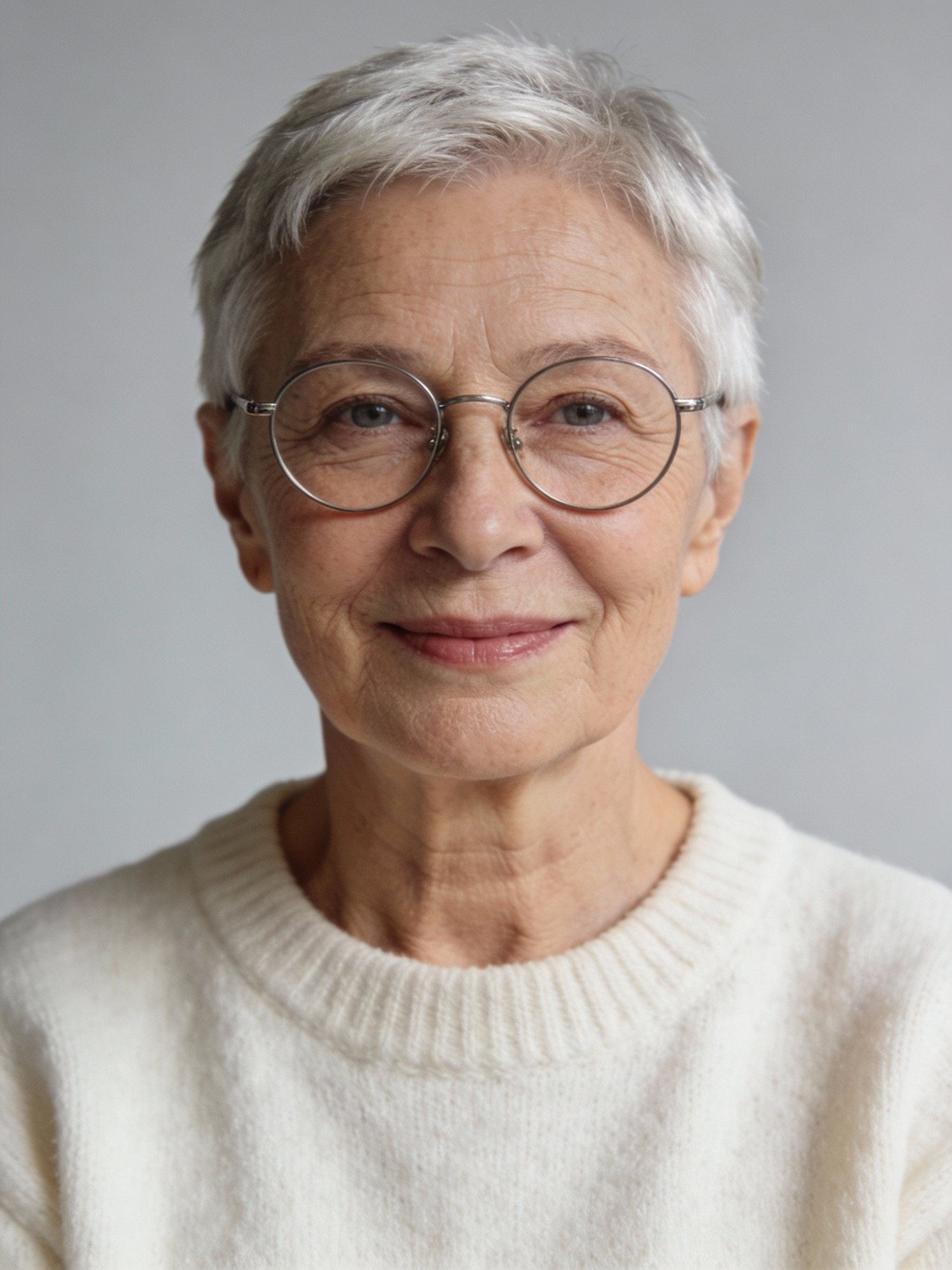 Scandi-minimal studio portrait of an elderly person; short silver hair; round metal eyeglasses; outfit: cream knit sweater, no logos; pale cool-gray seamless backdrop; soft Rembrandt lighting with gentle fill; 105 mm macro-sharp. Expression: warm and serene, subtle closed-mouth smile. Framing: 3:4, mid-chest-up, centered, eye-level, front view; no props.