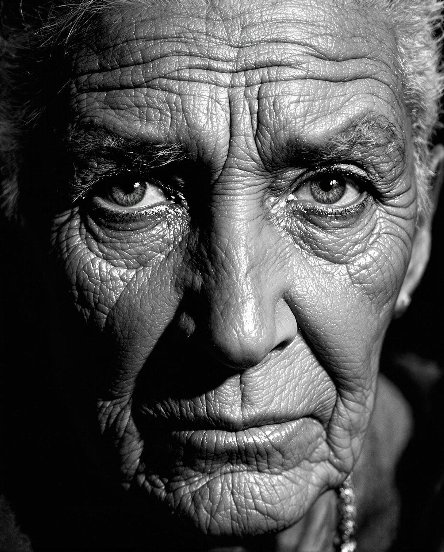 Close-up black-and-white portrait of an elderly person with expressive eyes and detailed facial lines, evoking a sense of reflection and depth.