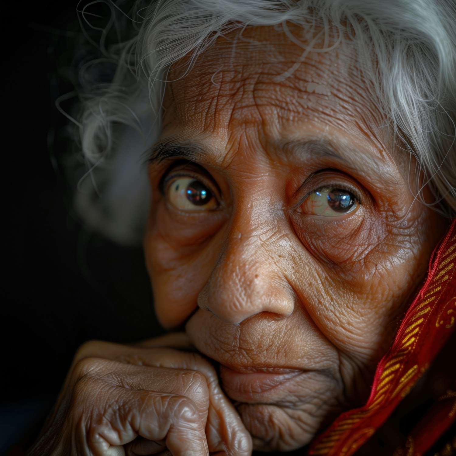 Close-up of an elderly woman with expressive eyes, white hair, and a red garment, conveying wisdom and cultural richness.