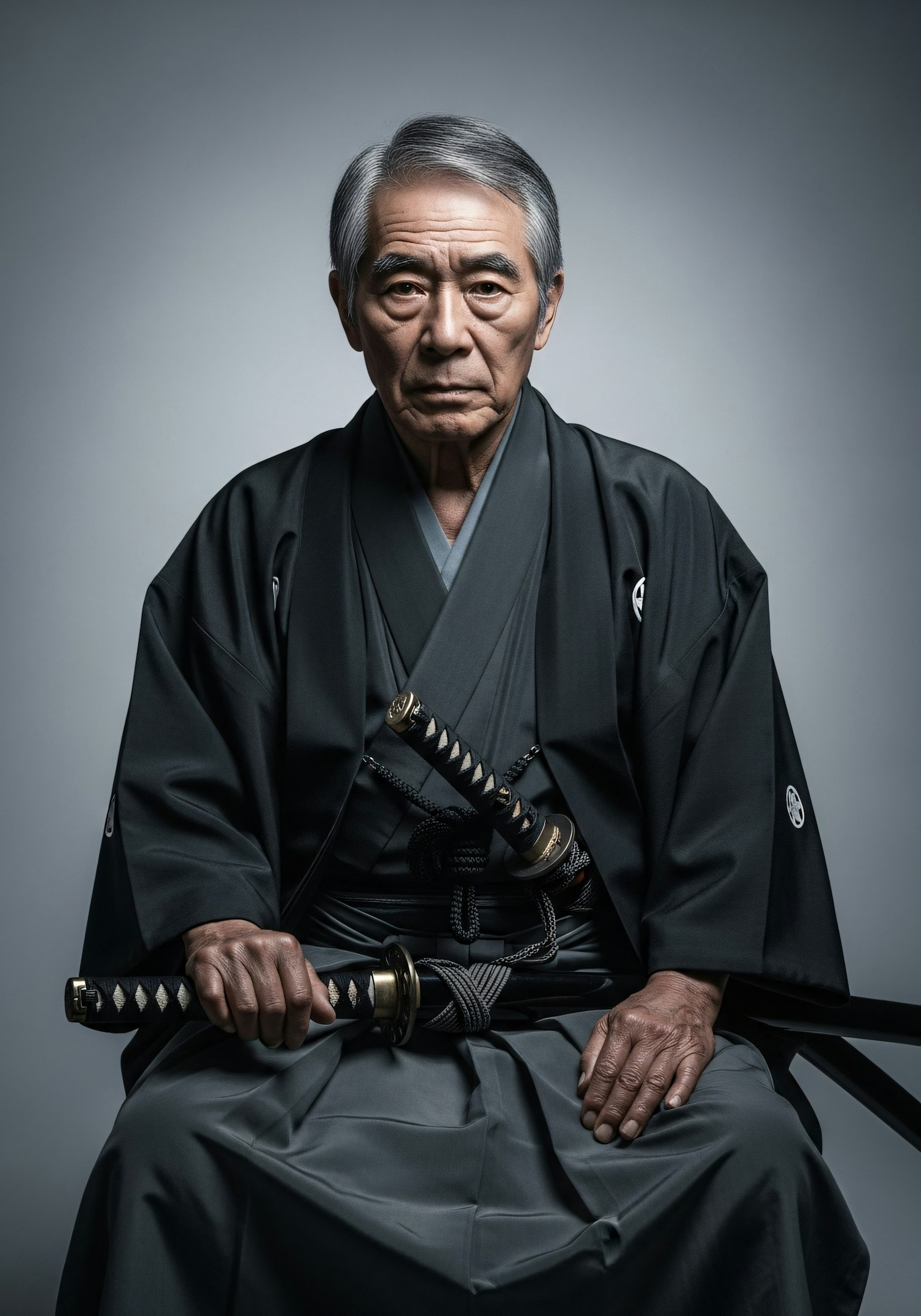 Elderly man in traditional black kimono holding a katana, with a serious expression and a neutral background.
