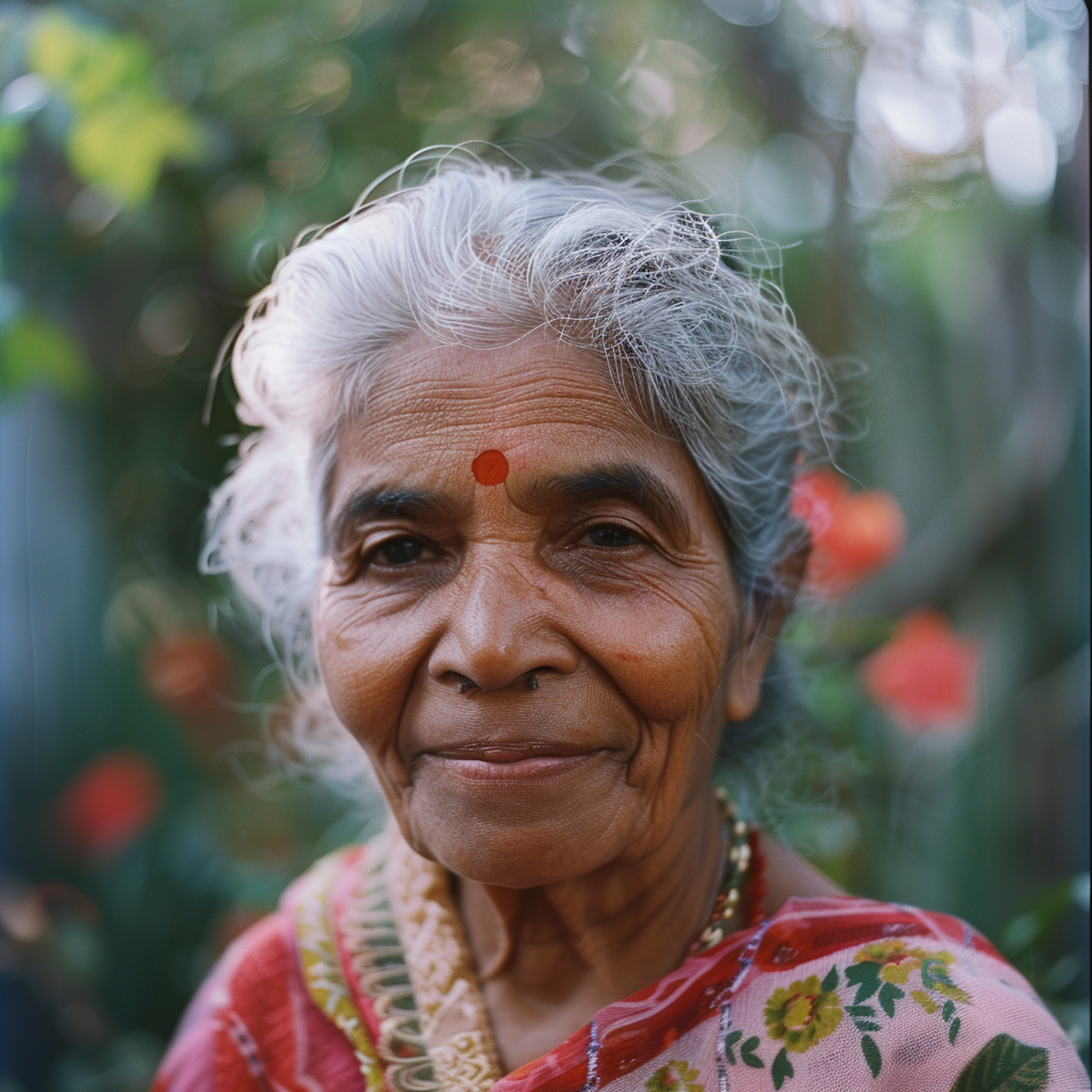 Elderly South Asian woman with silver hair, red bindi, and floral saree, smiling warmly against a lush, blurred green and red floral background.