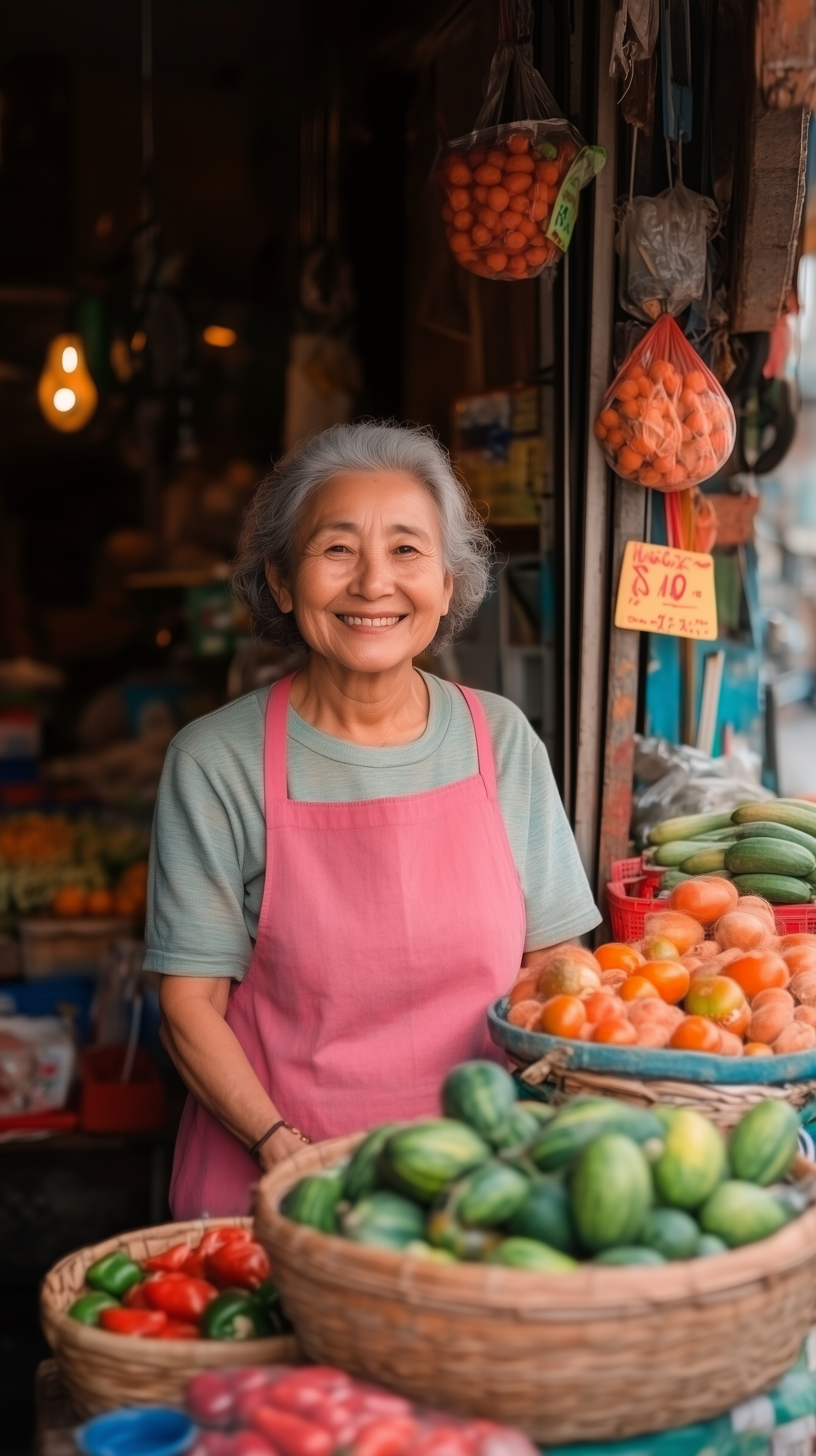 Elderly woman in a pink apron smiles at a vibrant market stall filled with fresh vegetables and colorful produce.