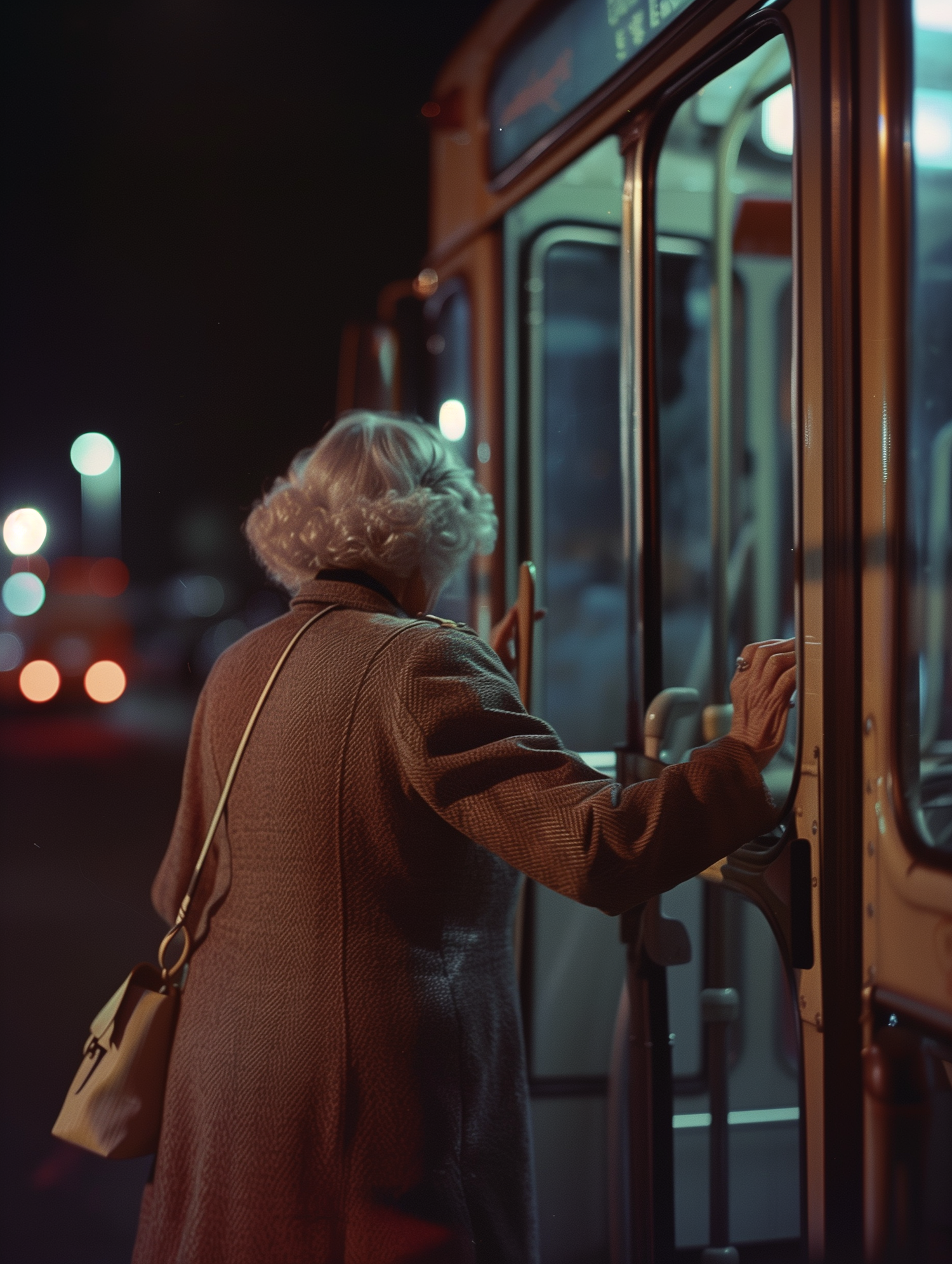 Elderly woman with white hair boards a bus at night, wearing a long coat and carrying a handbag. Soft city lights in the background.