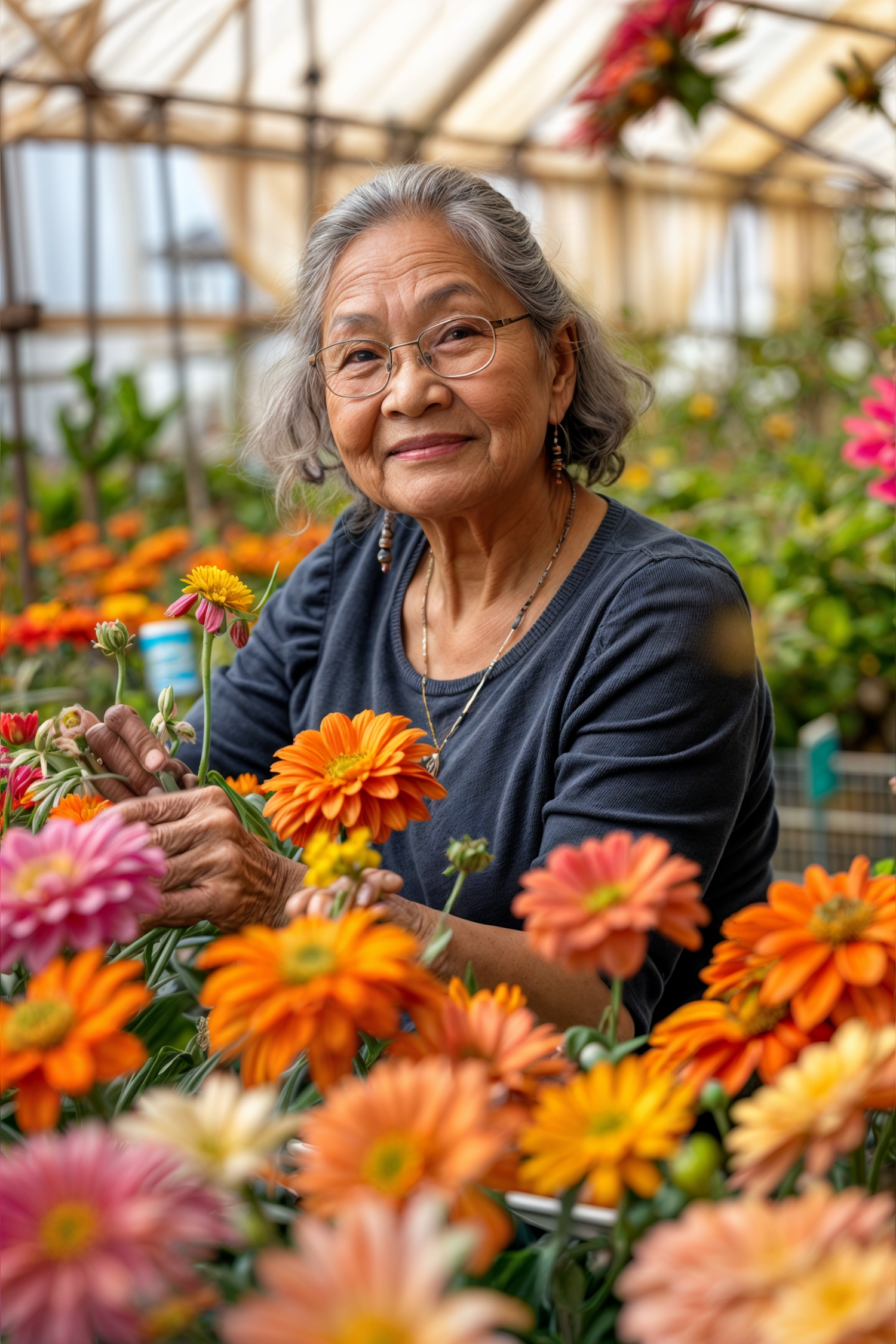 Elderly woman in a greenhouse, tending to vibrant orange and pink flowers with a warm smile and gentle touch.
