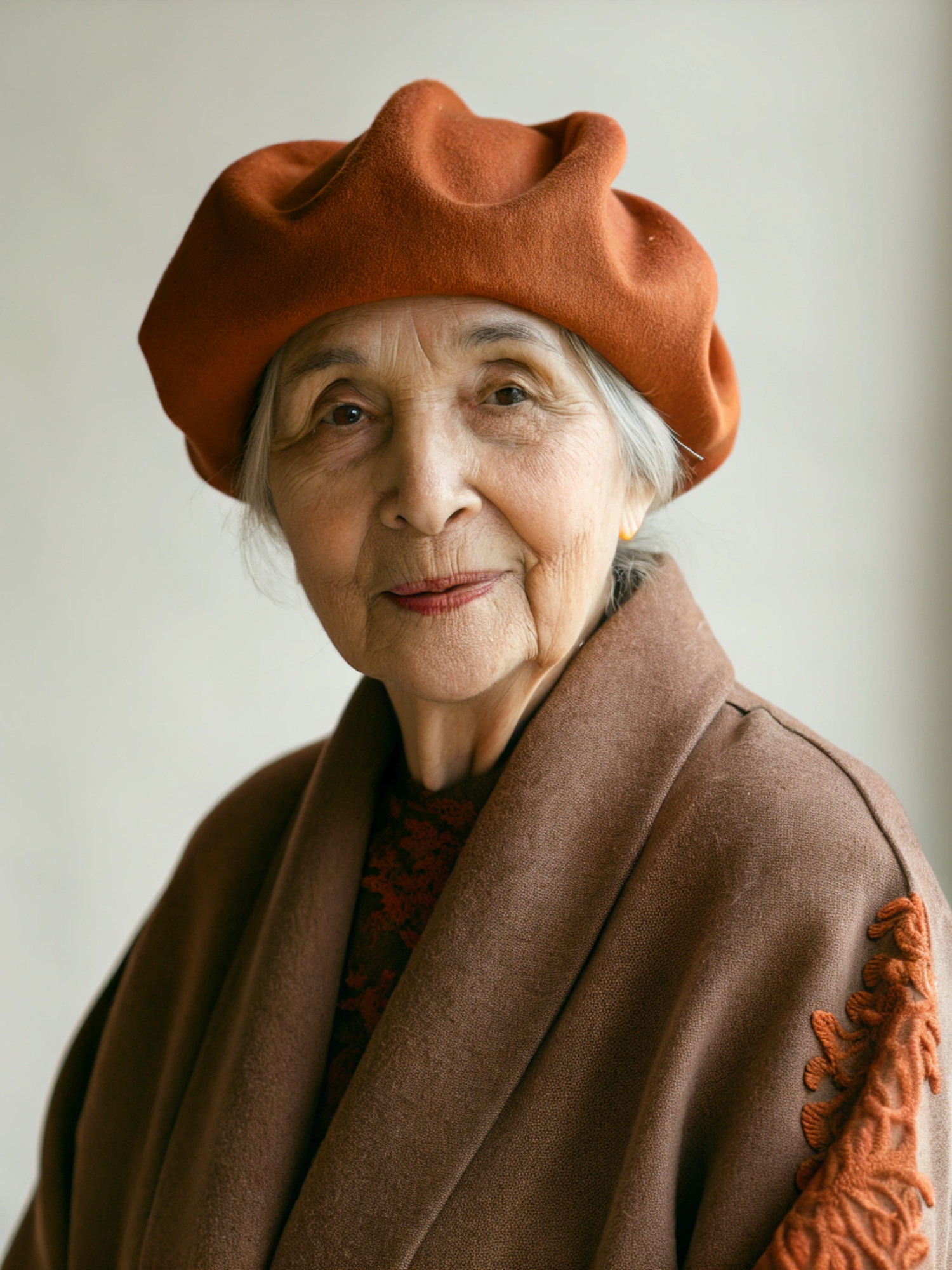 Elderly Asian woman in an orange beret and brown coat with embroidery, exuding elegance and warmth against a neutral background.