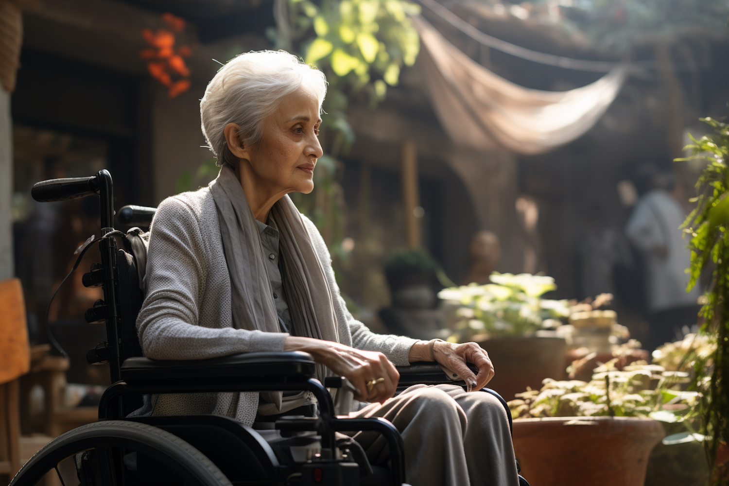 Elderly woman in a wheelchair, gazing thoughtfully in a serene garden setting with soft sunlight and lush greenery.