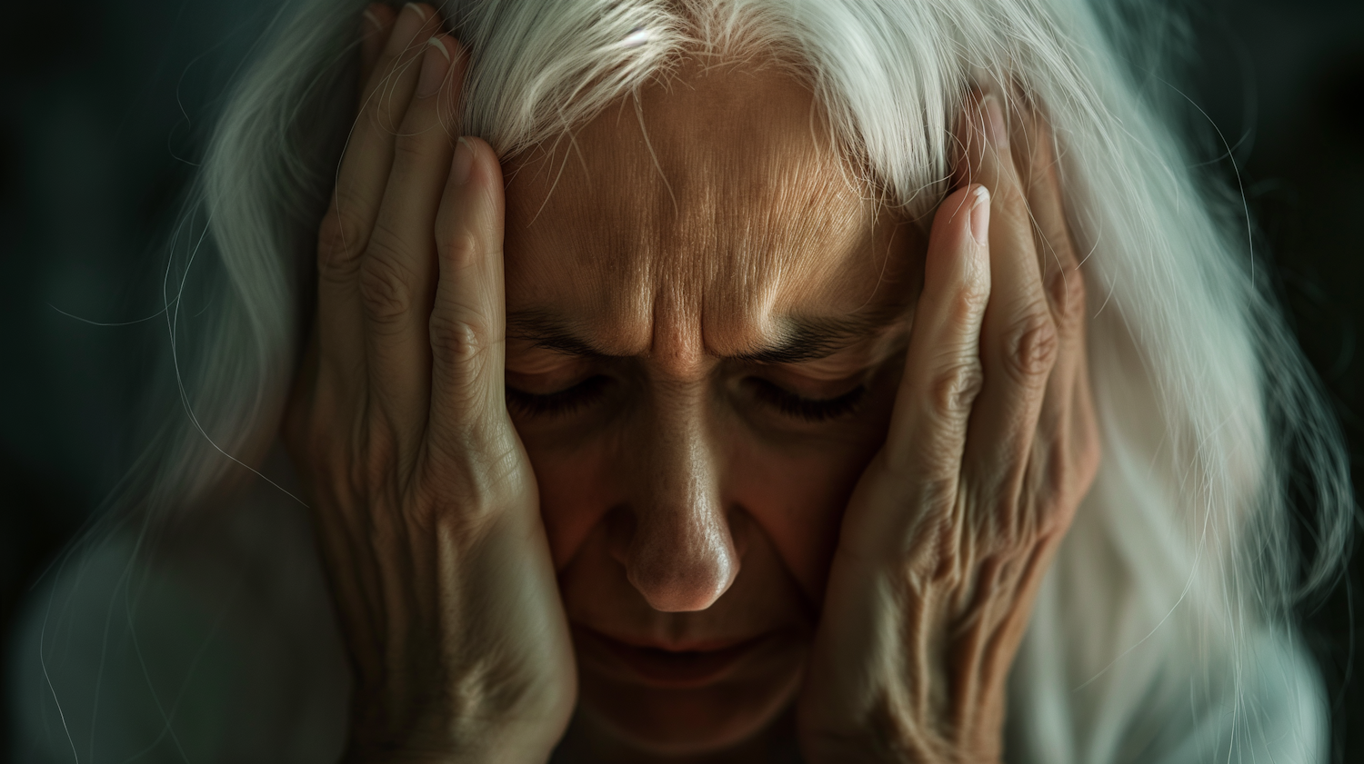 Elderly woman with white hair, eyes closed, hands on temples, expressing stress or concentration in a close-up shot.