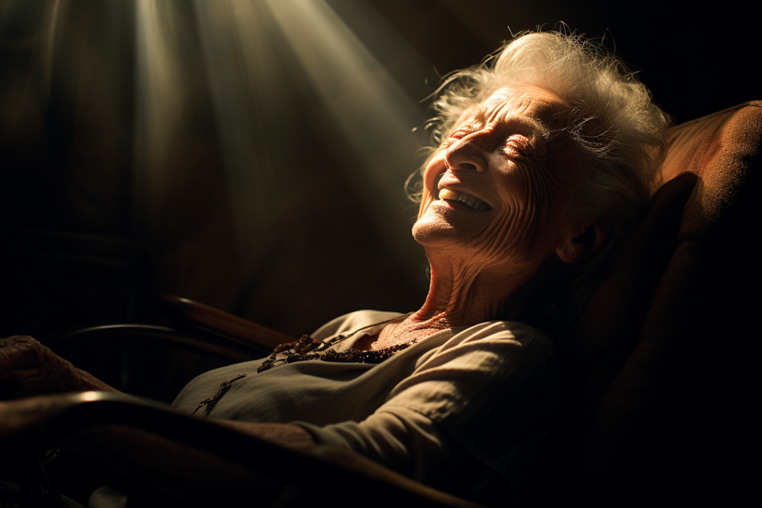 Elderly woman with white hair smiles peacefully in warm golden light, creating a serene and contemplative atmosphere.