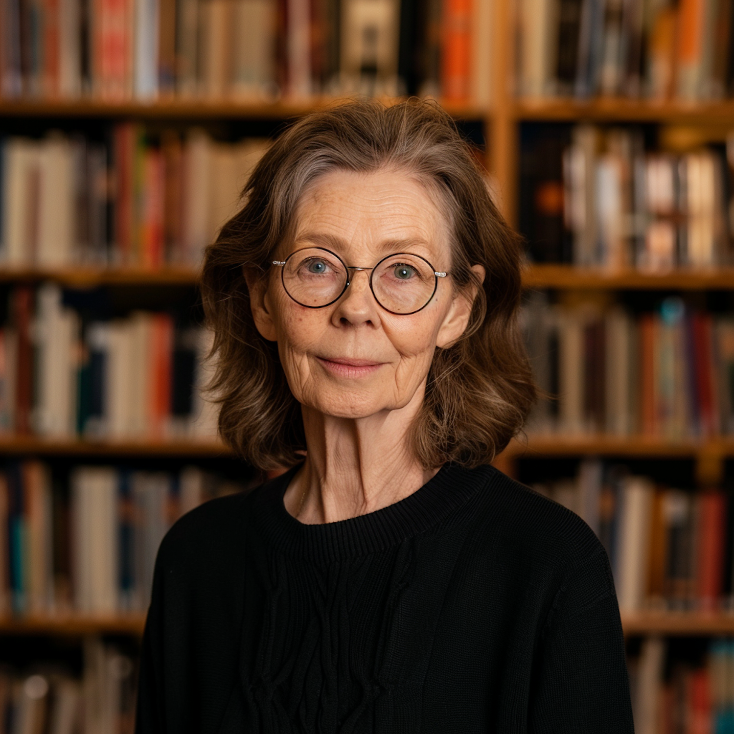 Elderly woman with round glasses and brown hair in a library setting, wearing a black sweater. Warm lighting and blurred bookshelves.