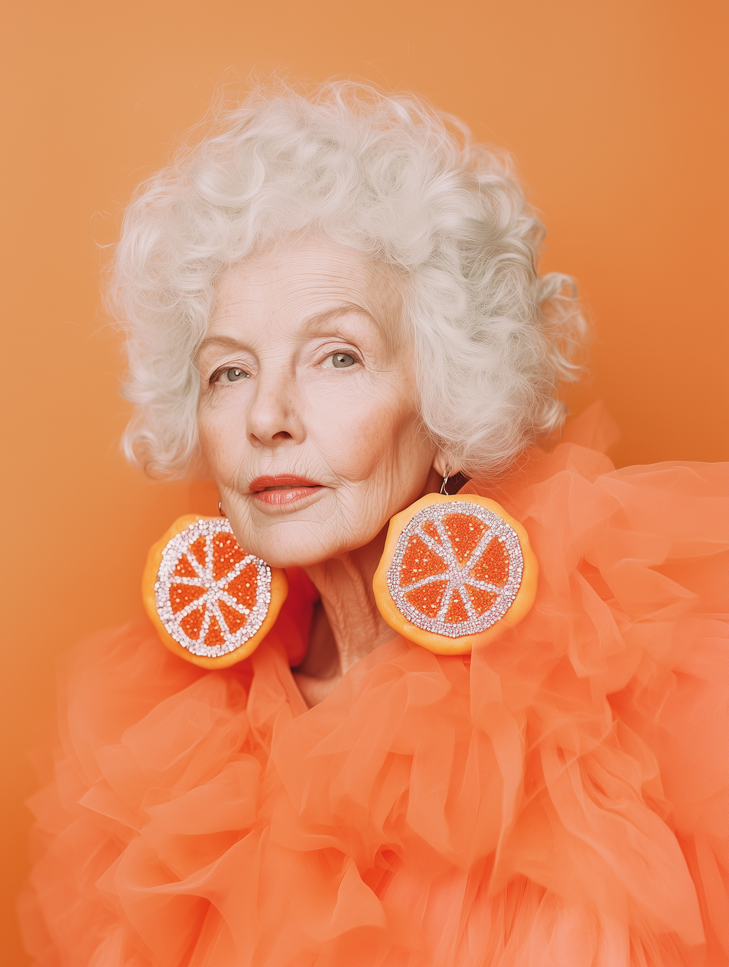 Elegant elderly woman with curly white hair, citrus-inspired earrings, and orange attire against a vibrant orange background.